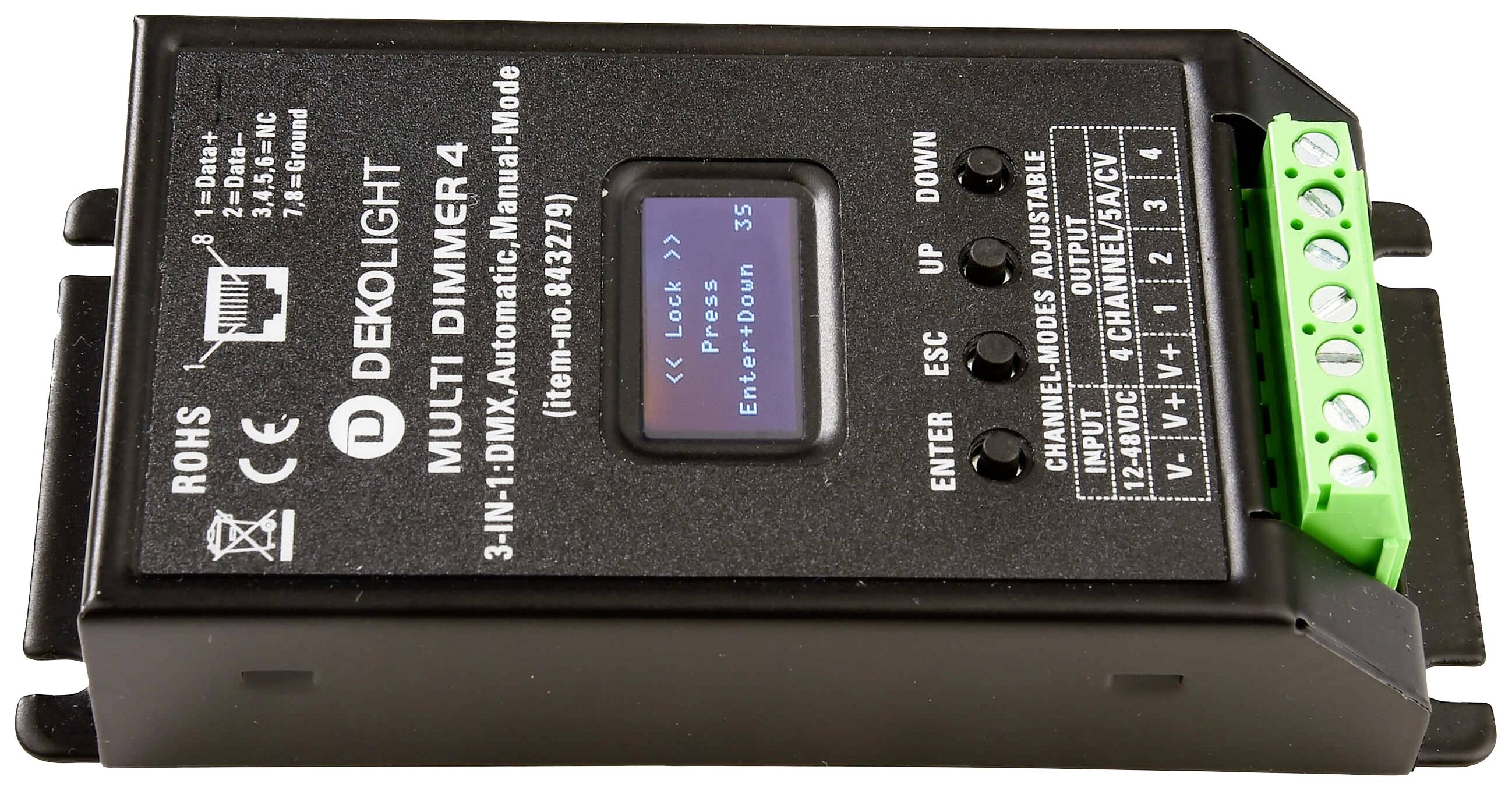 Einfacheste Programmierung aller Einstellungen via Display und 4-Knopf-Bedienmenü / 3-IN-1 Steuerung mit DMX / Automatik / Manueller Modus / Flickerfrei 2kHz / einstellbar 1-4 Kanäle / 12V= 240W / 24V= 480W / 48V= 960W