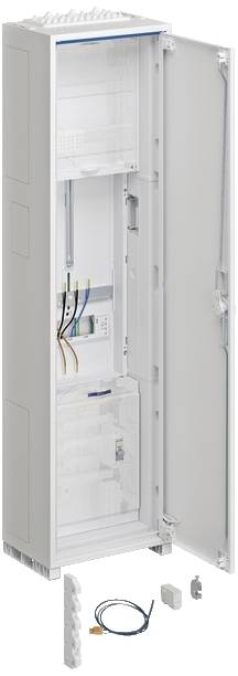 Komplettschrank,univers Z,1 Zählerplatz,3P.,H=1100mm,1-feldig,ESA. Zählerschranklösung Schrankgehäuse nach DIN VDE 0603/1, Maßnorm DIN 43 870 zur Aufputz, Unterputz oder teilversenkter Montage. Bestehend aus Schrank mit Tür aus pulverbeschichtetem, eingebranntem, stabil profiliertem 1 mm dickem Stahlblech. Innenauskleidung komplett aus Kunststoff. Leitungseinführungen oben und unten durch eingebaute Kunststoffflanschplatten. Rückseitige Vorprägung im Kunststoffteil. Sammelschienendurchführungen als beidseitige seitliche werkzeuglos zu öffnende Flansch im unteren Bereich als Möglichkeit zur Sammelschienenverbindung von verschiedenen Schränken oder in Verbindung mit einem Kabelanschlusskasten und Anschlusssatz. Neben der Durchführung im NAR zusätzlich Öffnungen im Bereich des AAR (für Bauhöhe 1100 und 1400 mm) und RfZ (für Bauhöhe 1100mm). Tür frontbündig mit innenliegenden, justierbaren Scharnieren, wahlweise rechts oder links anschlagbar mit 110° Öffnungswinkel. Türverschluss mit Vorreiber. Türverschluss durch andere Schließungen austauschbar. Schrank nebeneinander und übereinander anflanschbar. Schrankgröße 1- bis 5-feldrig mit 72 bis 540 Platzeinheiten (PLE). Hinweis: Die Hauptleitung ist nach VDE-AR-N 4100:2019-04 von unten oder seitlich in den unteren Anschlussraum des Zählerschrankes einzuführen und dort anzuschließen. Höhe: __ mm (1100mm oder 1400mm) Breite: __ mm Tiefe: 205 / 160 mm, RAL-Farbe: 9010 Schutzart 44, Schutzklasse II Nennstrom des Sammelschienensystems 250 A Ausführung nach VDE-AR-N 4100:2019-04 Zähleranlage für __ Zählerplatz(e). Nach den technischen Anschlussbedingungen (TAB) des VNB __ für: __ Elektronische Haushalts-Zähler (eHZ) oder __ Zähler mit 3-Punktbefestigung (3HZ). __ für Bezugsanlagen mit haushaltsüblichem Verbrauch max. 63 A (10mm²) nach DIN 18015-1 ( __ Wohnungen, __ Allgemein, __ Reserve, __ Wärmepumpe) __ für Dauerstromanwendungen max. 32 A (10 mm²) nach VDE-AR-N 4100:2019-04 (z.B. PV bis 22 KW) __ für Dauerstromanwendungen max