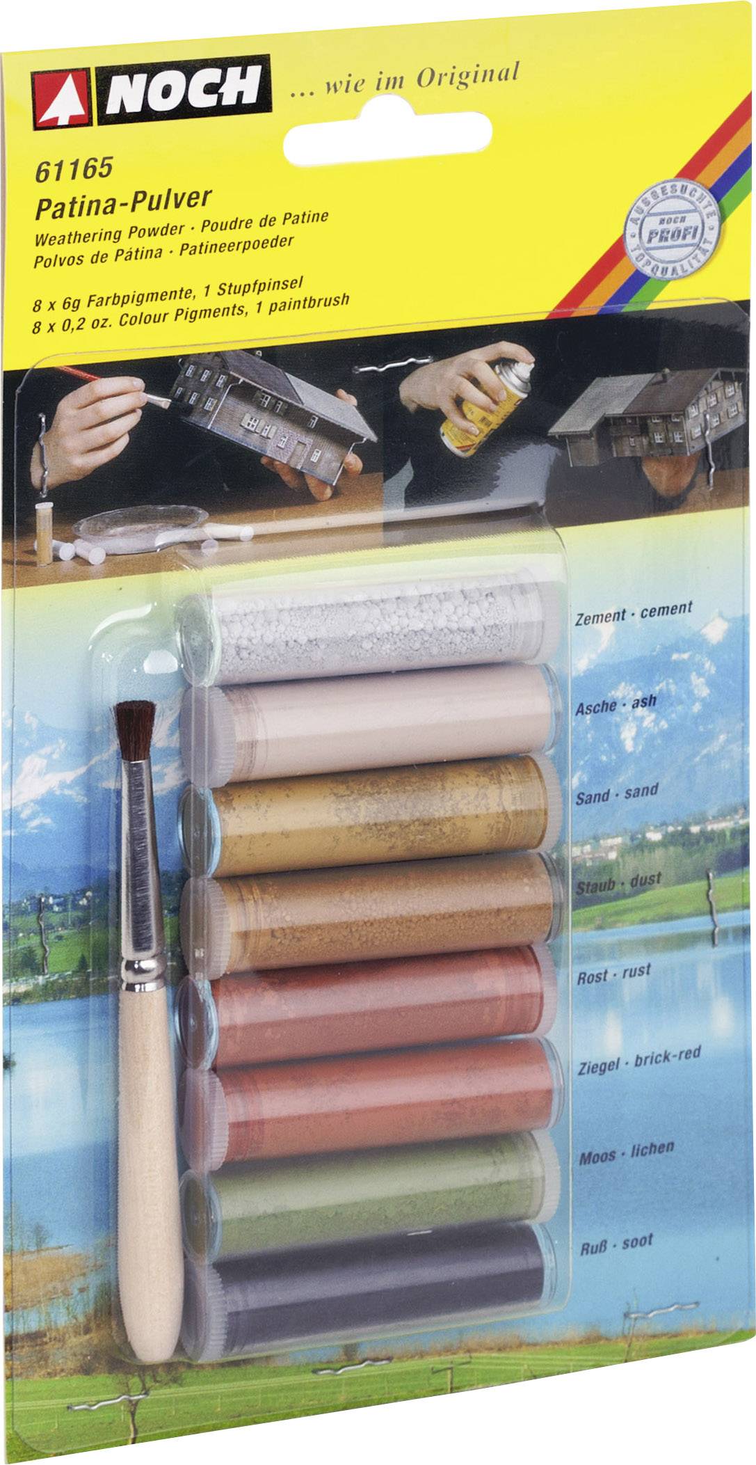 Patina-Pulver lässt glänzende Kunststoffoberflächen "verschwinden" und alles erhält eine wie natürlich gealterte Oberfläche. Mit diesen Farben altern Sie Brücken, Häuser, Fahrzeuge, Loks, Waggons, Portale. und es eignet sich jetzt auch hervorragend für den Einsatz bei Flugzeug-, Panzer- oder Schiffsbausätzen. Farben: zement, asche, sand, staub, rost, ziegel, moos, ruß Anwendung - Um den Farbpigmenten einen besseren Halt zu geben, sprühen Sie zuerst eine dünne Schicht Haft- und Fixierspray auf das zu patinierende Objekt auf. Anschließend mischen Sie die trockenen Farbpigmente, bis Sie den gewünschten Farbton haben. Nehmen Sie die trockenen Farbpigmente mit dem beiliegenden Stupfpinsel auf und "tupfen" Sie sie auf die zu alternde Oberfläche. Versiegeln Sie die gealterte Oberfläche, indem Sie erneut eine dünne Schicht Haft- & Fixierspray auftragen.
