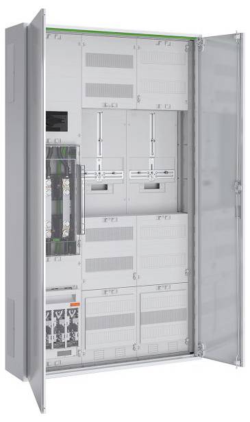 Wandlermessschrank 200 A Dauerstrom nach TAB Netze-BW bestehend aus: Zählerschrank schutzisoliert in IP44, 3x NAR mit 40 mm Sammelschienensystem 2x12x5 mm bestückt mit NH1-Trenner, 4x Sammelschienenklemme 120 mm², 1x Sammelschienenklemme 70 mm², 1x Wandlermodul BxH 250x450 mm mit Klarsichtabdeckung, 3x Wandlerlasche Bauform A mit 30x5x170 mm, 1x AAR BxH 250x450 mm mit Lasttrennschalter 3-polig 250 A und Klemme für N und PE, 1x Wandlerzusatzraum BxH 250x300 mm 24 TE bestückt mit Spannungspfadsicherungen 3x LS 1p B10 25kA und Wandler-Trennklemmen nach TAB Netze-BW, 1x 3-Punkt Zählerplatz 450 mm, 1x 3-Punkt FRE-Platz 450 mm, 1x APZ-Raum 300 mm mit RJ45 Schnittstelle