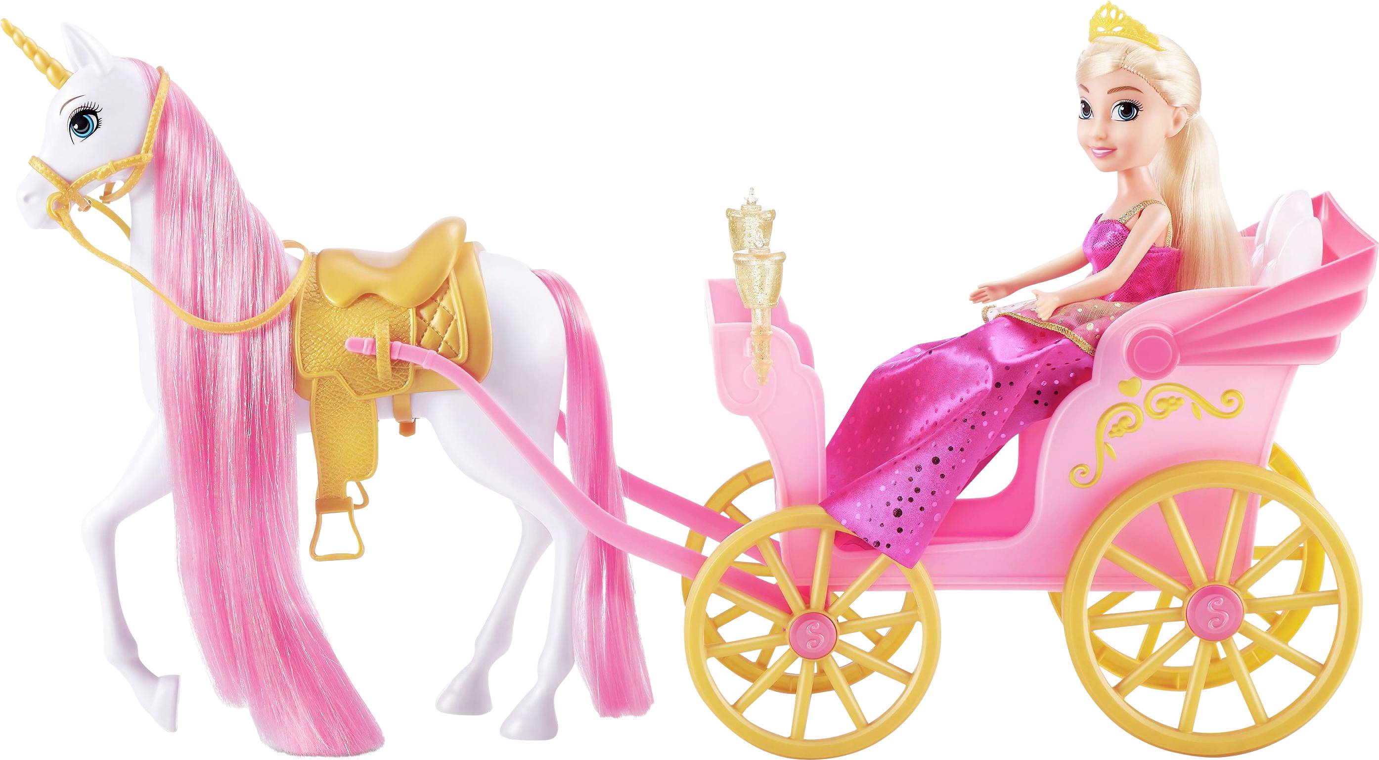 Mit dem ZURU Sparkle Girlz Prinzessin mit Einhorn und Kutsche Spielset fährst du in die magische Welt der Sparkle Girlz! Diese Prinzessin trägt ein wunderschönes Prinzessinnen-Outfit. Ihr königliches Einhorn ist mit Perlen verziert und hat langes, glitzerndes Haar zum stylen und spielen. Die Räder der Prinzessinnenkutsche drehen sich für unendlichen Spielspaß.