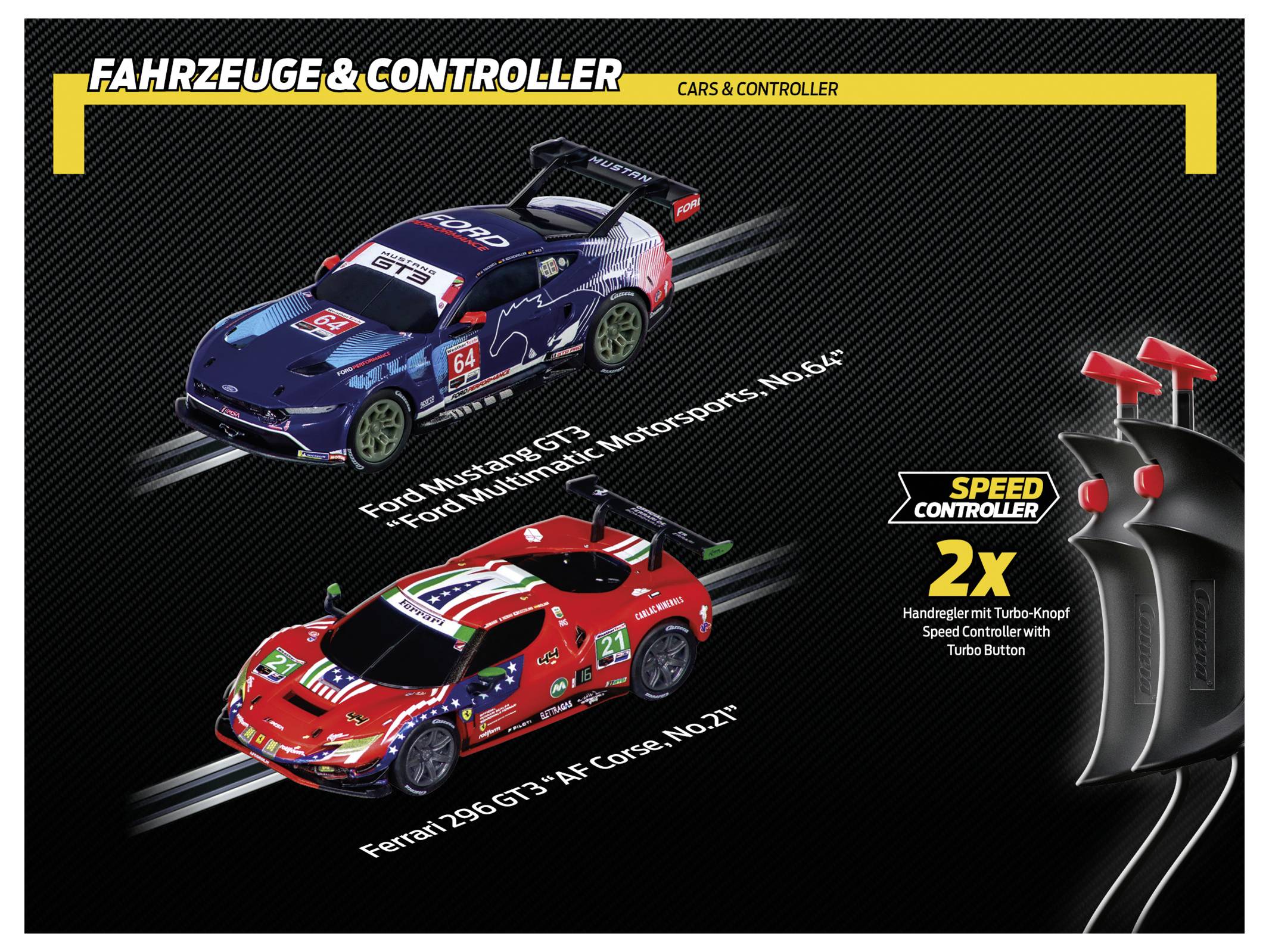 Das Carrera GO!!! Set „GT Powerplay“ entführt Spieler in ein rasantes Racing-Abenteuer voller packender Duelle. Auf der 4,9-Meter-Strecke werden Highspeed-Geraden und rasante Kurven gemeistert, während der Looping für aufregende Herausforderungen sorgt. Im Zentrum stehen zwei außergewöhnliche GT-Ikonen: der Ford Mustang GT3 und der Ferrari 296 GT3. Beide Fahrzeuge sind bekannt für ihren Einsatz in prestigeträchtigen Rennserien wie der IMSA und der GT World Challenge. Die Spieler steuern die detailgetreuen Boliden präzise durch die Strecke, erleben Überholmanöver hautnah und fühlen den Nervenkitzel, wenn jede Millisekunde zählt. Dank der Turbo-Buttons am Handregler werden Höchstgeschwindigkeiten erreicht, die jeden Moment zu einem Erlebnis machen.
