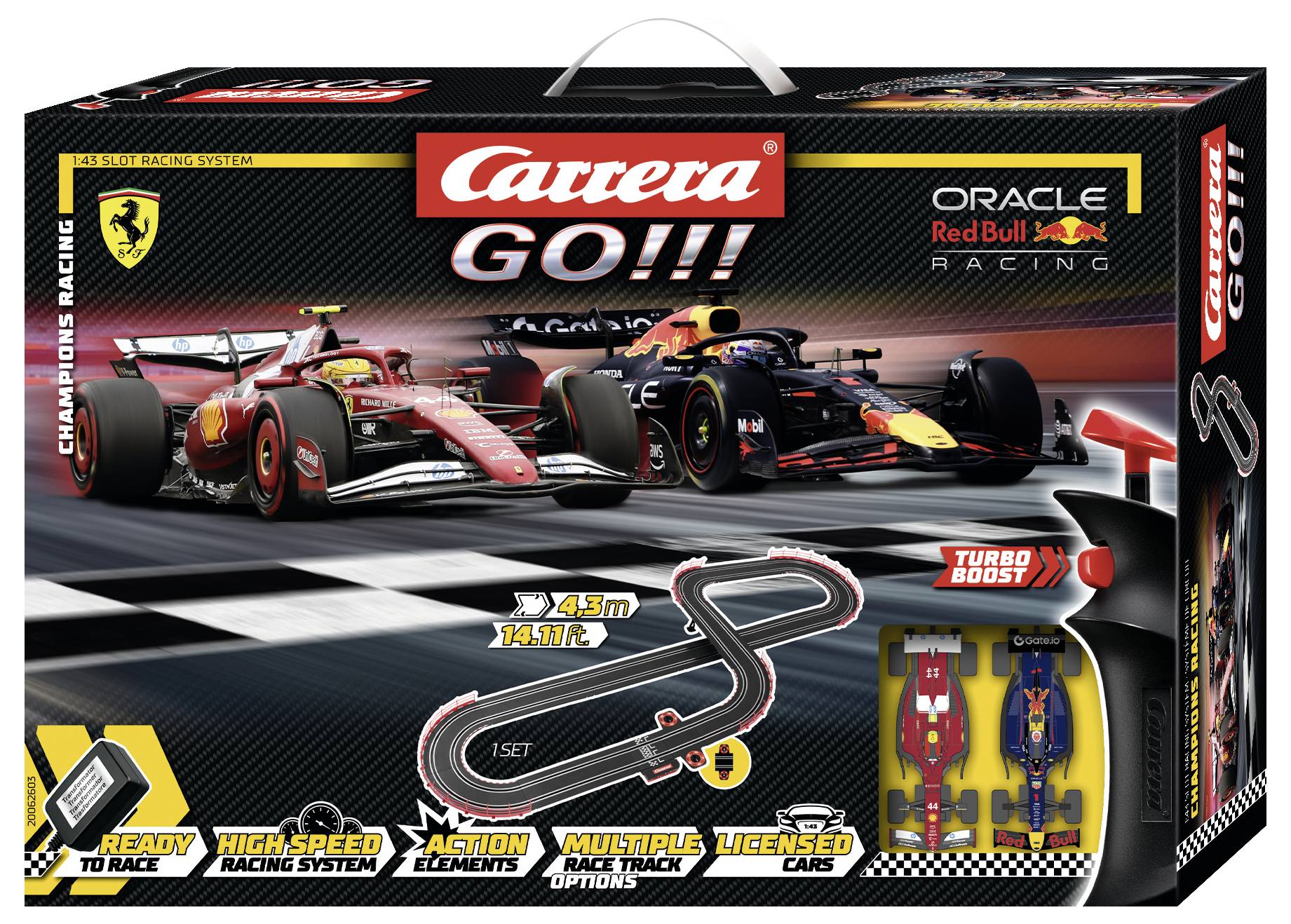 Im Carrera GO!!! „Champion's Racing“ Set geht es um mehr als nur Geschwindigkeit – hier treffen zwei Legenden der Formel 1 aufeinander. Auf der 4,3 Meter langen Strecke liefern sich der Oracle Red Bull Racing RB21 „M. Verstappen, No.1“ und der Ferrari SF-25 „L. Hamilton, No.44“ packende Duelle, die nicht nur die Fans, sondern auch die Piloten an ihre Grenzen bringen. Die Strecke fordert präzise Manöver und blitzschnelle Reaktionen. Mit den Turbo-Handreglern holen die Rennfahrer das Maximum aus ihren Maschinen und fliegen mit Höchstgeschwindigkeit über die Highspeed-Geraden. Jeder Moment auf dieser Bahn ist ein echtes Formel 1-Erlebnis, bei dem es nur um eins geht: Wer bleibt cool und behält die Führung?