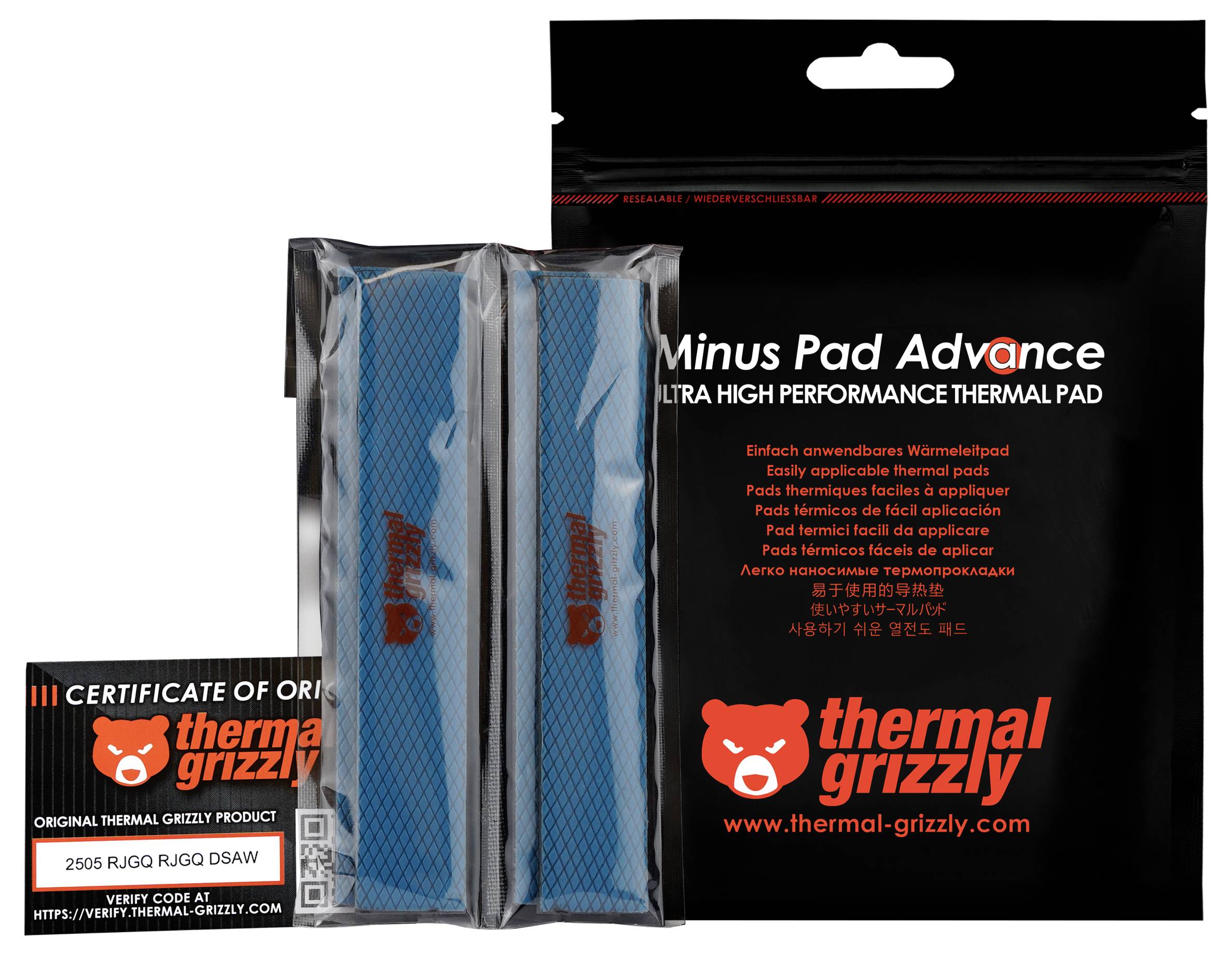 Die Thermal Grizzly Minus Pad Advance Wärmeleitpads sind Teil der Basic-, Advance- und Pro-Serie. Die Advanced-Pads sind einfach in der Anwendung und bieten im Vergleich zu den Basic-Pads eine bessere Wärmeleitfähigkeit sowie eine höhere Kompressibilität.