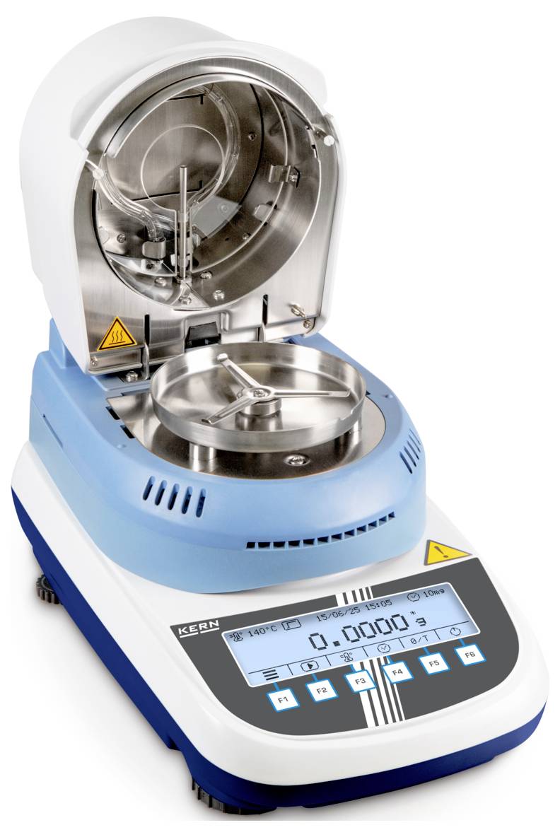 Hinterleuchtetes Grafik-LCD-Display, Ziffernhöhe 11 mm · 6 Direkttasten für schnellen Zugriff auf die Hauptfunktionen · Startbildschirm: · [[1]] Hauptmenü · [[2]] Trocknungsvorgang starten · [[3]] Trocknungstemperatur auswählen · [[4]] Abschaltkriterium auswählen · [[5]] Nullstellen/Tarieren · [[6]] Stand-by · Während der Messung: · [[7]] Aktuelle Temperatur · [[8]] Aktuelles Heizprofil · [[9]] Aktives Abschaltkriterium · [[10]] Trocknungsvorgang abbrechen · [[11]] Trocknungsvorgang anhalten · [[12]] Aktuelle Trocknungsparameter anzeigen · [[13]] Einheit der Ergebnisanzeige umschalten · Nach Ende der Messung: · [[14]] Trocknungsprogramm verlassen · [[15]] Messprotokoll drucken · [[16]] GLP Parameter (de)aktivieren, editieren · [[17]] Ergebnis detailliert anzeigen · [[18]] Einheit der Ergebnisanzeige umschalten · Halogen-Quarzglasstrahler 400 W · Bedienerführung in 6 Sprachen (DE, EN, FR, IT, ES, PT) · Automatisches Tarieren beim Start einer Messung durch Schließen des Deckels · Der letzte Messwert bleibt solange im Display stehen, bis er durch eine neue Messung überschrieben wird · [[19]] GLP intern · Ausdruck von Waagen-ID, Projekt-ID, Benutzer-ID, ermittelte Werte des Trocknungsvorgangs etc. · 10 Probenschalen inklusive · Arbeitsschutzhaube im Lieferumfang enthalten · Applikationshandbuch: Im Downloadcenter finden Sie zu jedem KERN-Feuchtebestimmer ein praktisches Applikationshandbuch mit vielen Beispielen, Erfahrungsberichten, Einstellungen und Tipps;