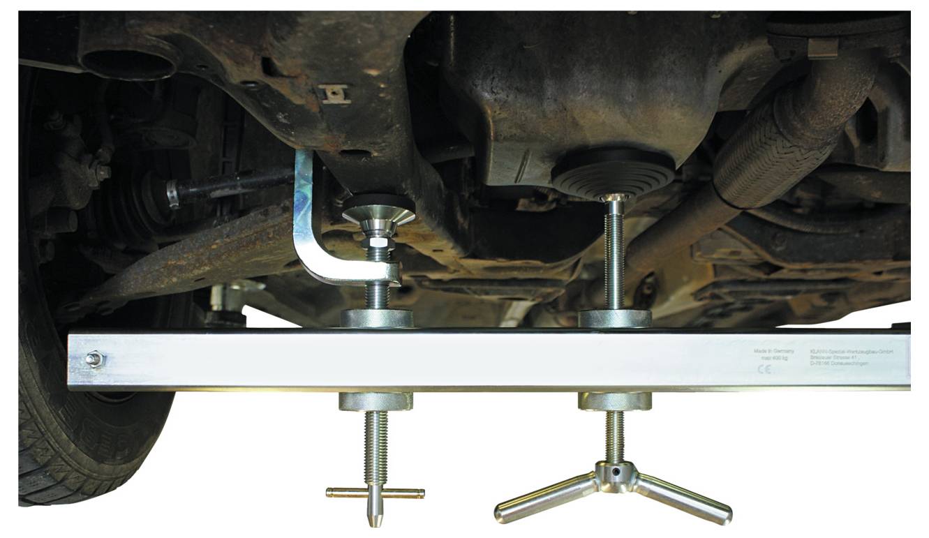 Zum einfachen und sicheren Abstützen von PKW Motoren, erforderlich z.B. beim Zahnriemen-, Wasserpumpen- oder Motorlagerwechsel. Durch seine spezielle Konstruktion, den individuell einstellbaren und großflächigen Spannhaken, den dementsprechend großen Auflageflächen und der einzigartigen Fixierung der Abstützvorrichtung am Fahrzeugrahmen, wird der Motor in seiner Position über den 100 mm großen Stützteller fixiert und abgestützt. Somit hat der Mechaniker einen freien Zugang von oben und unten sowie gleichzeitig einen sicher gehaltenen Motor, selbst z.B. beim Drehen der Motorwellen, beim Lösen und Festdrehen von Befestigungsschrauben etc. Die Spannhaken sind 360° drehbar und können je nach Fahrzeugbeschaffenheit universell angeordnet werden. Nachdem die Abstützvorrichtung bzw. die Spannhaken am Fahrzeug eingehängt wurden, werden diese am Fahrzeug und an der Abstützvorrichtung festgespannt. Ein Verrutschen oder gar Abrutschen der Abstützvorrichtung ist somit nicht möglich. Die Abstützvorrichtung KL-0146-20 bietet ein Höchstmaß an Sicherheit bei einem universellen Einsatzbereich ohne weiteres erforderliches Zubehör wie z.B. fahrzeugspezifischen Haltern etc.
