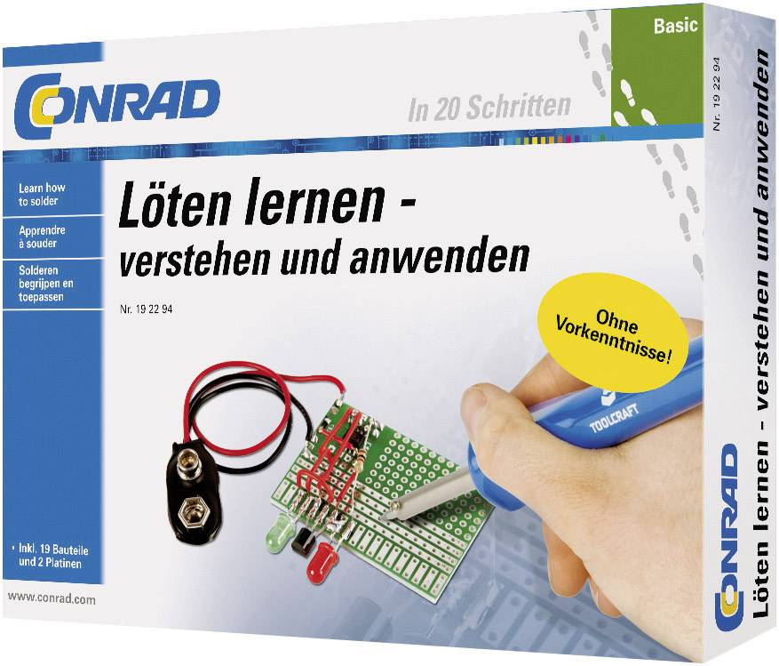 Das Lernpaket vermittelt in 20 Schritten die für das erfolgreiche Löten erforderlichen Grundlagen und zeigt Ihnen anhand praktischer Experimente, wie Sie selbst Schaltungen in mehreren Varianten löten können. Lernen Sie so auch den Umgang mit elektronischen Bauteilen kennen. Zugleich bieten die fertig gelöteten Schaltungen auch eine Funktionskontrolle, die Ihnen zeigt, ob Sie alles korrekt ausgeführt haben.