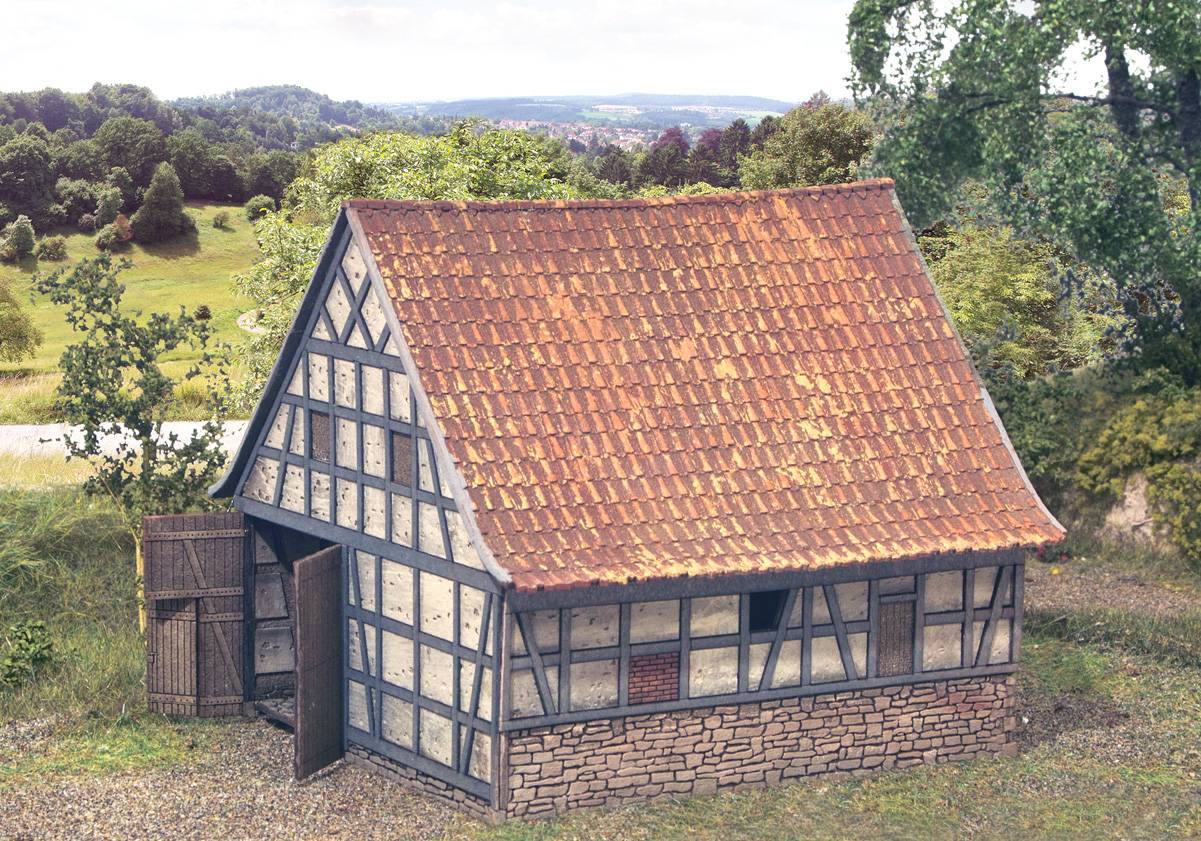 Fachwerkscheune, 2mm-Karton, laser-graviert und -geschnitten, Bausatz aus 2mm-Karton; laser-graviert und -geschnitten; der Bausatz kann individuell bemalt werden
