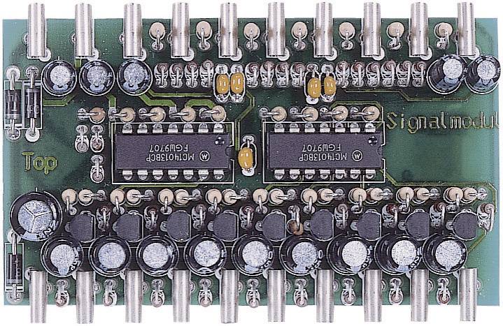 Für 2 Lichtsignale, von denen eines ein vierbegriffiges Ausfahrsignal und eines ein Vorsignal sein kann. Weicher Lichtwechsel. Dunkeltastung des Vorsignals möglich, wenn es am gleichen Mast wie das Hauptsignal angebracht ist. Das Steuermodul besitzt kein Relais zur Zugbeeinflussung und ist daher besonders gut geeignet für computergesteuerte Digitalanlagen oder wenn keine Zugbeeinflussung gewünscht wird. Ansteuerung über Tastenpulte, Einzeltaster, Gleiskontakte oder Digitaldecoder. Baustein betriebsfertig aufgebaut und geprüft.