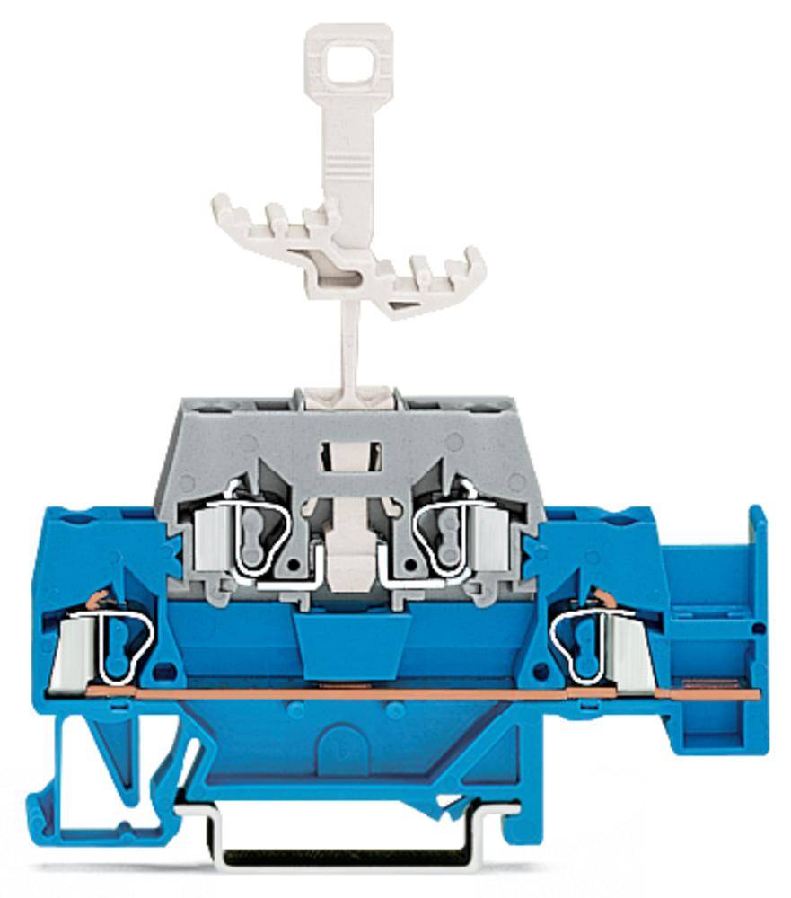 Durchgangs-/Trennklemme, mit zusätzlicher Querbrückung blau/grau.