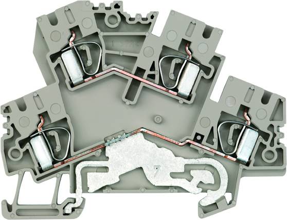 Doppelstock-Reihenklemme. Z-Reihenklemme mit Zugfederanschluss, Bemessungsquerschnitt: 4 mm², Zugfederanschluss, Wemid, dunkelbeige. Reihenklemmen in Zugfedertechnik, die Z-Reihe, sind speziell auf Kundenanforderungen zugeschnitten: Geringer Bauraum, großzügige Markierungsflächen, integrierter Prüfabgriff, Querverbindbarkeit innerhalb der Z-Reihe und zu weiteren Weidmüller Reihenklemmenfamilien. Die Klemmen der Z-Reihe verfügen über einen großen Klemmbereich und bis zu zwei Querverbindungskanäle. Mit steckbaren Standardquerverbindungen lassen sich Potenziale über eine beliebige Klemmenanzahl verteilen.