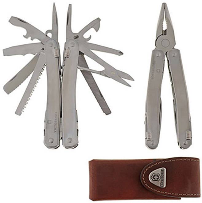 Holzsäge · Metallfeile · Metallsäge · Holzmeissel / Schaber · Spiritklinge, Normal- und Wellenschliff · Schraubendreher 2mm · Schraubendreher 3mm · Phillips-Schraubendreher für PH1 und PH2 · Schere · Leder-Gürteletui · Drahtschneider für dünne/weiche Drähte 40 HRc · Kistenöffner · Kabelmantel-Längsschneider · Drahtbieger · Drahtabisolierer und -schaber · Kabelmantel-Querschneider · Hartdraht-Schneider · Befestigungsöse · Entriegelungs-Schieber · Separate Federn · Kombi-Spitzzange · Stech-Bohrahle · Kapselheber · Dosenöffner · Ziehhaken · Schraubendreher 6 mm · Kupplung für Korkenzieher.