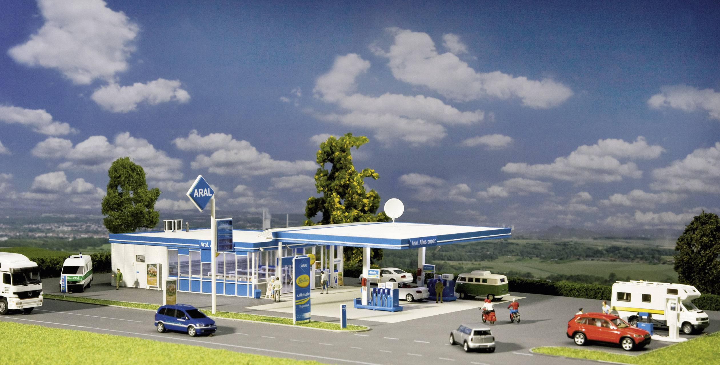 Moderner Tankstellenbetrieb, der sich aus einem großflächigen, überdachten Tanksäulenbereich mit einem komplett eingerichteten Verkaufs-Shop und einer getrennt stehenden Service-Station für Luft/Wasser/Reinigung zusammensetzt.