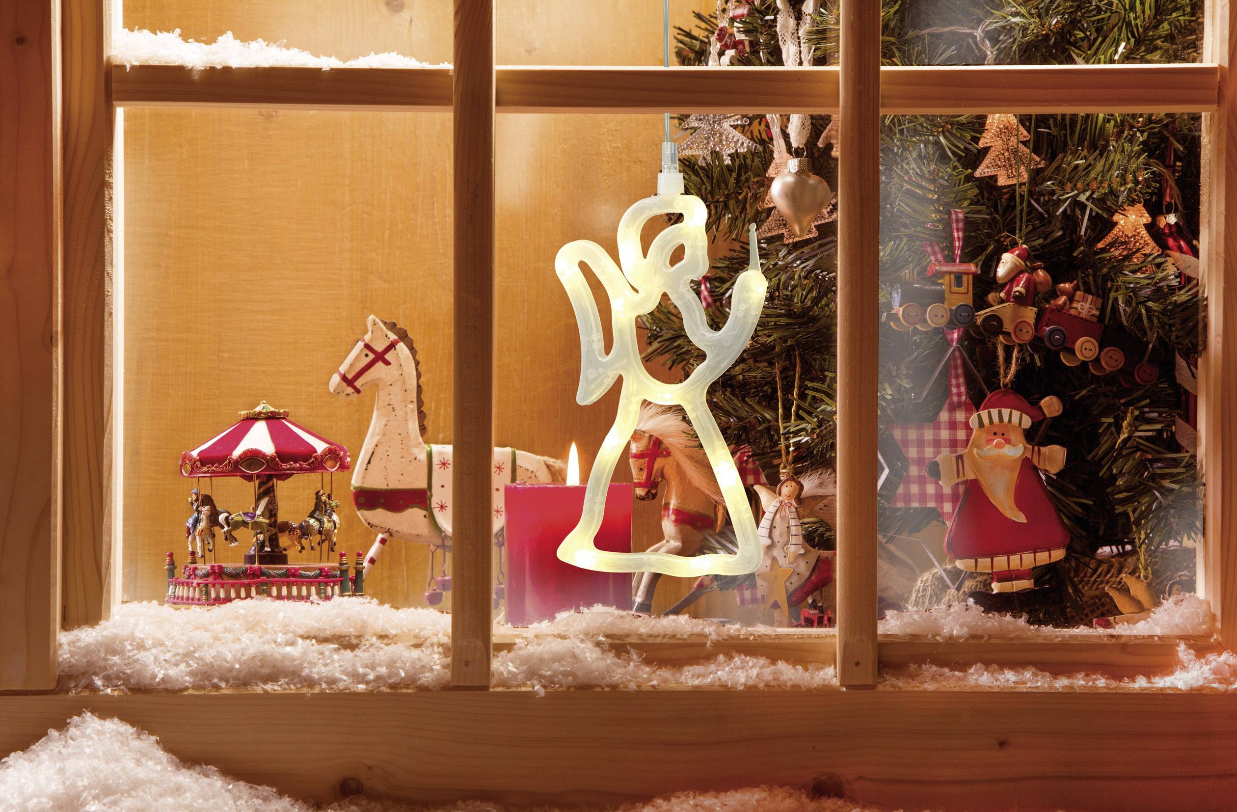 Ein leuchtender Engel im Fenster verbreitet gerade zu Weihnachten eine festliche Stimmung. Dieser batteriebetriebene 20 x 12 cm große Fensterschmuck für den Wohnbereich mit 10 warm-weißen LEDs wird alle Augen auf sich ziehen. Geschickt lässt es sich mit dem eingebauten Saugnapf einfach an jedes Fenster anbringen.