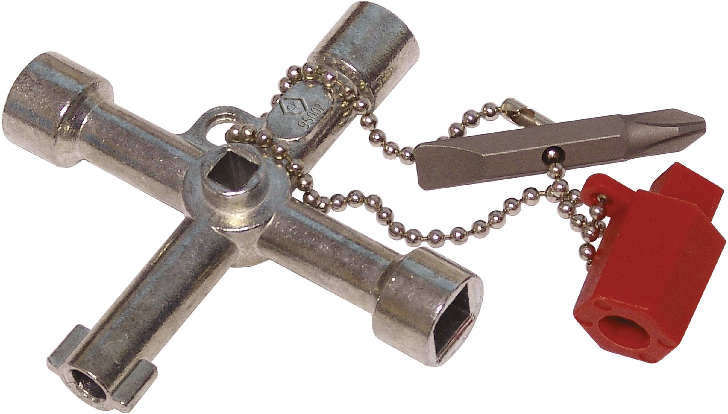 Universal Schaltschrankschlüssel aus Zinkdruckguss. In der Mittelnabe mit Heizungsentlüftungs-Schließung. Für fast alle gängigen Schließungen in der Elektrotechnik, Gas- und Wasserversorgung, Klima- und Belüftungstechnik, Industrie und viele mehr. Inklusive Kette mit Adapter und Wendebit: Schlitz 1,0 x 7 mm / PH2.