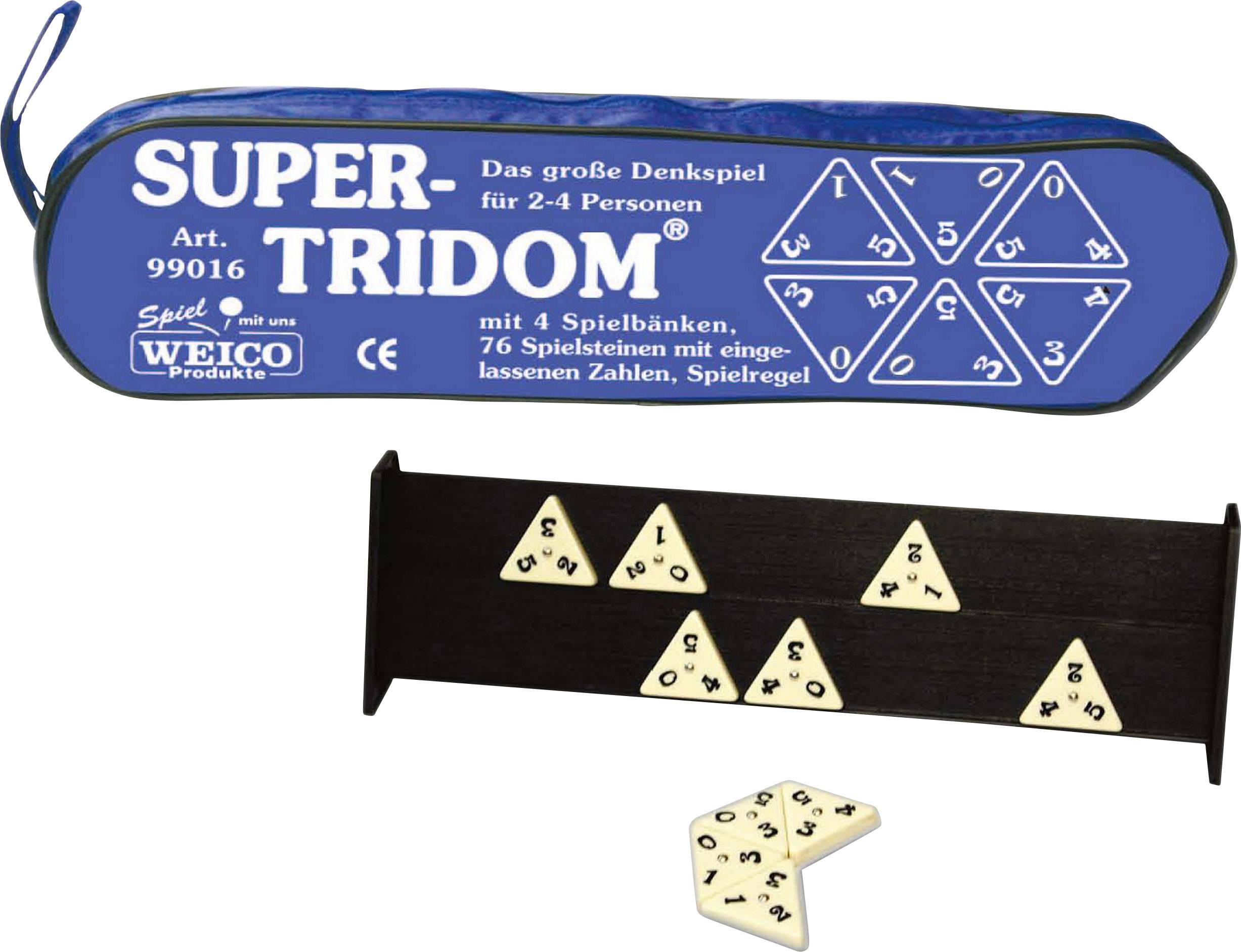 Super-Tridom mit 76 dreieckigen Spielsteinen fördert die Konzentration und das logische Denken. Das Spiel schafft Spannung und ist für Spieler aller Altersklassen geeignet. Es kann die ganze Familie gemeinsam beschäftigen; auch zu zweit gespielt kommt niemals Langeweile auf. Die Größe des Spiels und die praktische Verschlusstasche lassen dieses Spiel auch gerne zu einem Begleiter auf Reisen werden. Es führt Sie mit Freunden in aller Welt und an allen Plätzen zusammen! Wer Anlegespiele mag wird Super-Tridom lieben! Durch die dreiseitigen Anlegemöglichkeiten bietet es eine Vielzahl an Kombinationsmöglichkeiten. . In den 90er Jahren vorgestellt hat es sich unter unseren Markenspielen zum „Superklassiker“ entwickelt“.