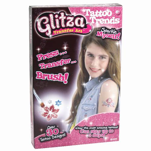 Glitza ist der Spaß für stylische Girls. Glitza ist eine dünne Kleberschicht, die auf die Haut aufgetragen wird und mit verschiedenfarbigen Glitterpudern sichbar gemacht werden kann - ein ganz individuelles Tattoo! Der Kleber und das Glitterpuder können auch auf Textilien angewendet werden. Damit die Tattoos auch wunderschön werden, ist alles dabei, was man dazu braucht. 4 Tattoo-Bögen, 3 Döschen Glitter 2 g, 1 Döschen mit 20 kleinen Edelsteinen, 1 Pinzette, 1 kleiner Pinsel, Beipackzettel. Ab 3 Jahren.