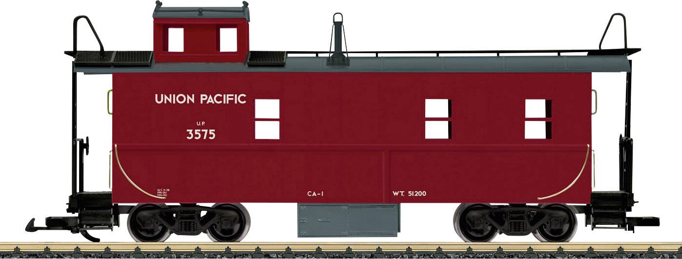 Modell eines Güterzugbegleitwagens Caboose wie er bis in die 50er-Jahre in allen Güterzügen eingesetzt wurde. Das Modell ist fein detailliert und mit einer vollständigen Inneneinrichtung ausgerüstet. Türen zum Öffnen. Metallradsätze, 2 Stück davon mit Kugellager zur Stromabnahme für die Innenbeleuchtung und die beleuchteten Schlusslaternen. Dem Wagen ist ein Stickerbogen mit Namenszügen und Wagennummern der Bahngesellschaften Union Pacific, Santa Fa, Southern Pacific, Pennsylvania Railroad und New York Central beigelegt, so dass der Wagen entsprechend beschriftet werden kann. Länge über Puffer 49 cm.