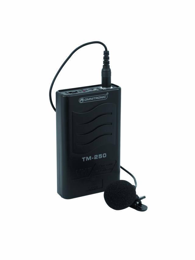 Hochwertiges VHF-Taschensenderset · Set enthält Taschensender, Headset und Lavalier-Mikrofon · Passend zu dem Empfänger VHF-450 mit gleicher Trägerfrequenz · Betrieb mit VHF-Festfrequenz 174,100 MHz · On/Off/Mute-Betriebswahlschalter · LED-Anzeige für Batteriekapazität · Sendeleistung 8,5 mW · 3,5-mm-Klinke-Schraubverbindung zu Kopfbügel- oder Lavalier-Mikrofon · Stromversorgung über 9-V-Block (inkl.) · Anmelde- und gebührenpflichtig