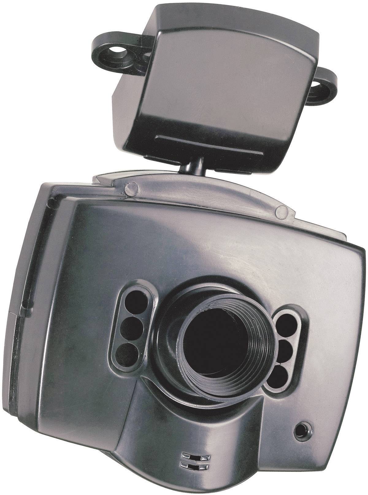 Kameragehäuse mit Aussparungen für Mikrofon und IR-LEDs. Dank des Schwenkkopfes lässt sich das Kameragehäuse universell ausrichten.