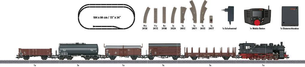 1 Dampflok · 1 Rungenwagen · 1 Gedeckter Güterwagen · 1 Schiebedachwagen · 1 Hochbordwagen · 1 Kesselwagen · 1 Privatwagen · 15 gebogene Gleise · 20 gerade Gleise · 1 Weiche rechts · 1 Bogenweiche links · 1 Bogenweiche rechts · 1 Prellbock · 1 Gleisanschlussbox · 1 Schaltnetzteil · 1 Mobile Station.
