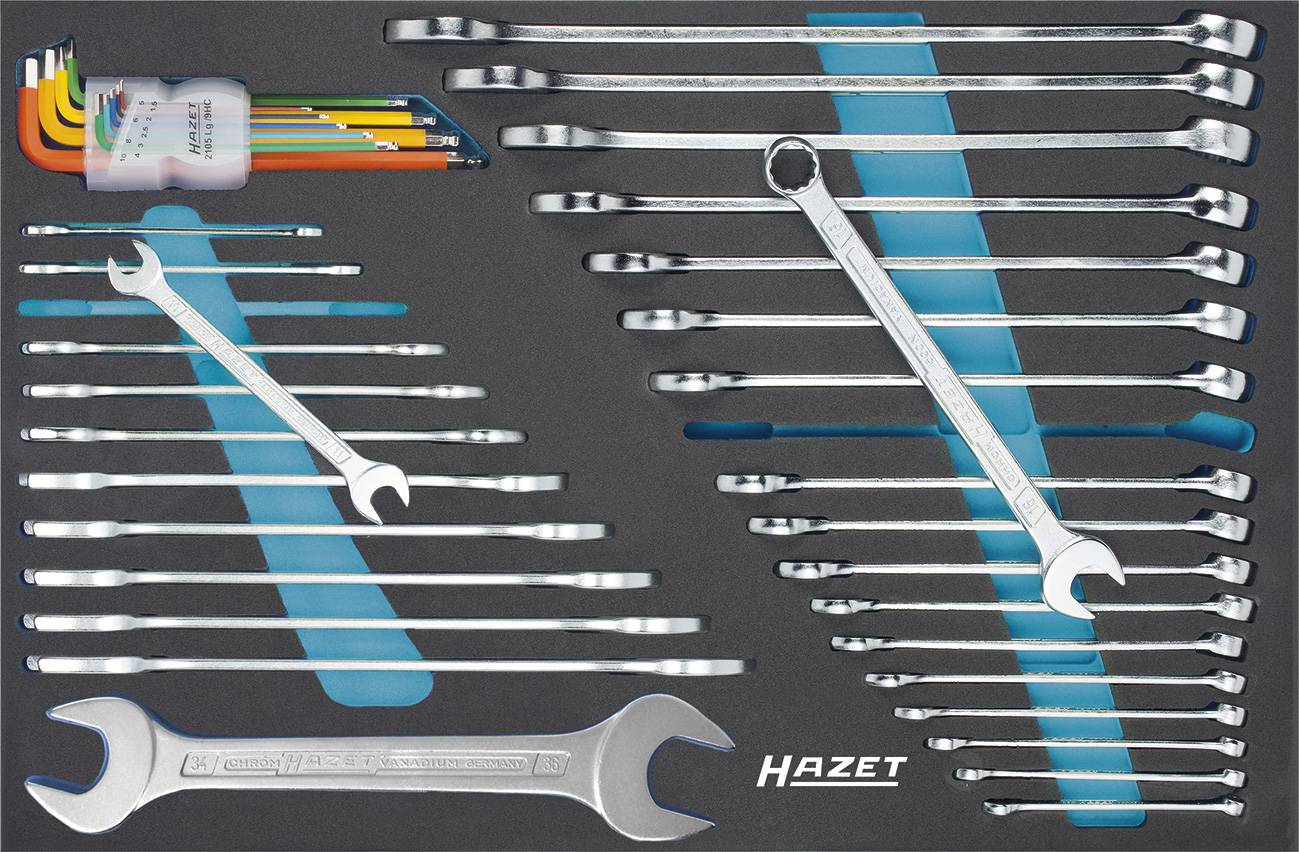 HAZET-Safety-Insert-System (SIS) Ordnungssystem Größe: 3/3 (519 x 342 mm) Anzahl Werkzeuge: 39 Stück Doppel-Maulschlüssel 450N-6X7 ∙ 450N-8X9 ∙ 450N-10X11 ∙ 450N-12X13 ∙ 450N-14X15 ∙ 450N-16X17 ∙ 450N-18X19 ∙ 450N-20X22 ∙ 450N-21X23 ∙ 450N-24X27 ∙ 450N-30X32 ∙ 450N-34X36 Ring-Maulschlüssel 603-6 ∙ 603-7 ∙ 603-8 ∙ 603-9 ∙ 603-10 ∙ 603-11 ∙ 603-12 ∙ 603-13 ∙ 603-14 ∙ 603-15 ∙ 603-16 ∙ 603-17 ∙ 603-18 ∙ 603-19 ∙ 603-21 ∙ 603-22 ∙ 603-24 ∙ 603-27 Farbiger Winkelschraubendreher-Satz, 9teilig 2105LG/9HCHAZET-Safety-Insert-System (SIS) Perfektes Ordnungssystem – alle Werkzeuge rüttelfest eingebettet Schnelle, integrierte Vollständigkeits-Prüfung – fehlendes Werkzeug wird sofort bemerkt Unendliche Kombinationsmöglichkeiten Passend für alle HAZET-Werkstattwagen Assistent mit Schubfächern Für die Werkstattwagen Assistent 173, 179 (XL-XXL) und 180 empfehlen wir zusätzlich Weichschaum-Einlagen 163-522x40 bzw. 163-522x50