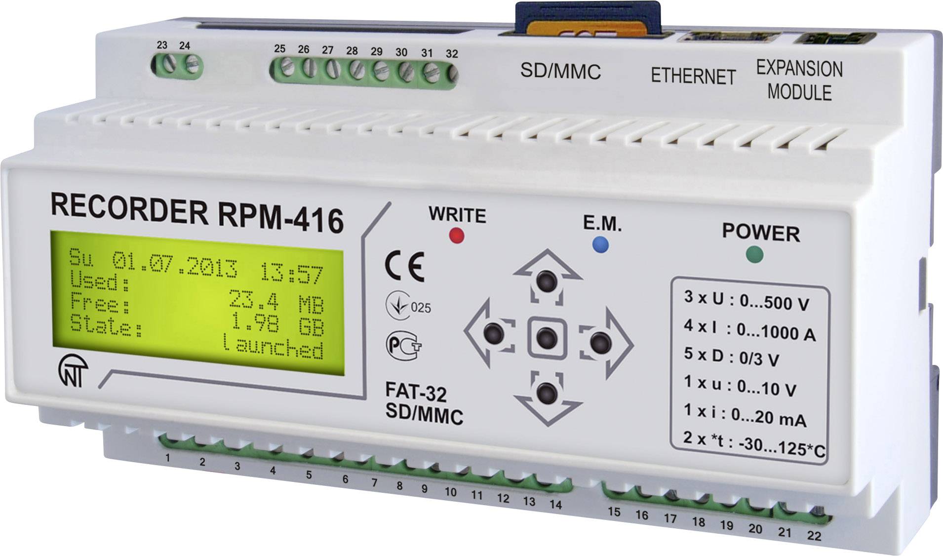 Das Registriergerät RPM-416 ist ein Mikroprozessor-basiertes Gerät und dient der Messung von elektrischen Daten, der Anzeige dieser Werte auf dem Display des Registriergerätes und der Datenarchivierung.