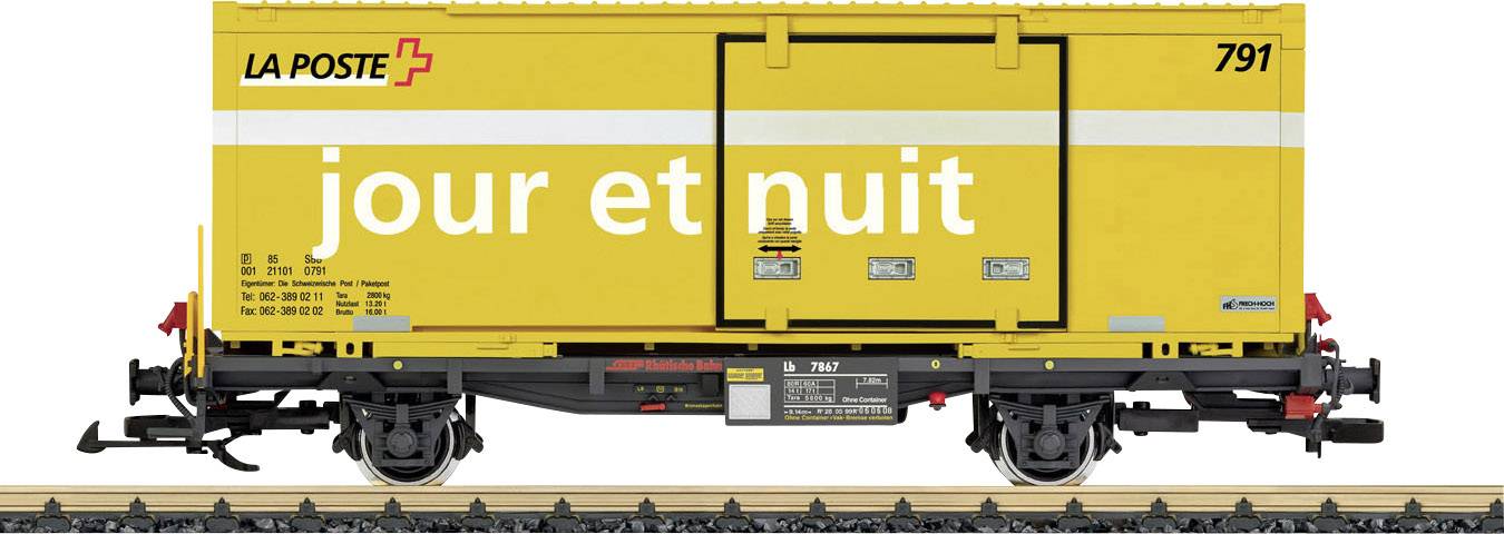 Zweiachsiger Containertragwagen der RhB mit neuer Betriebsnummer, in der Ausführung der Epoche VI. Beladen mit einem vorbildgerechten, mit der Betreibergesellschaft "La Poste" beschrifteten Post-Container. Neue Container-Nummer 791 mit dem Werbeschriftzug "jour et nuit". Aufwendige Bedruckung des Containers auch an der Containeroberseite.