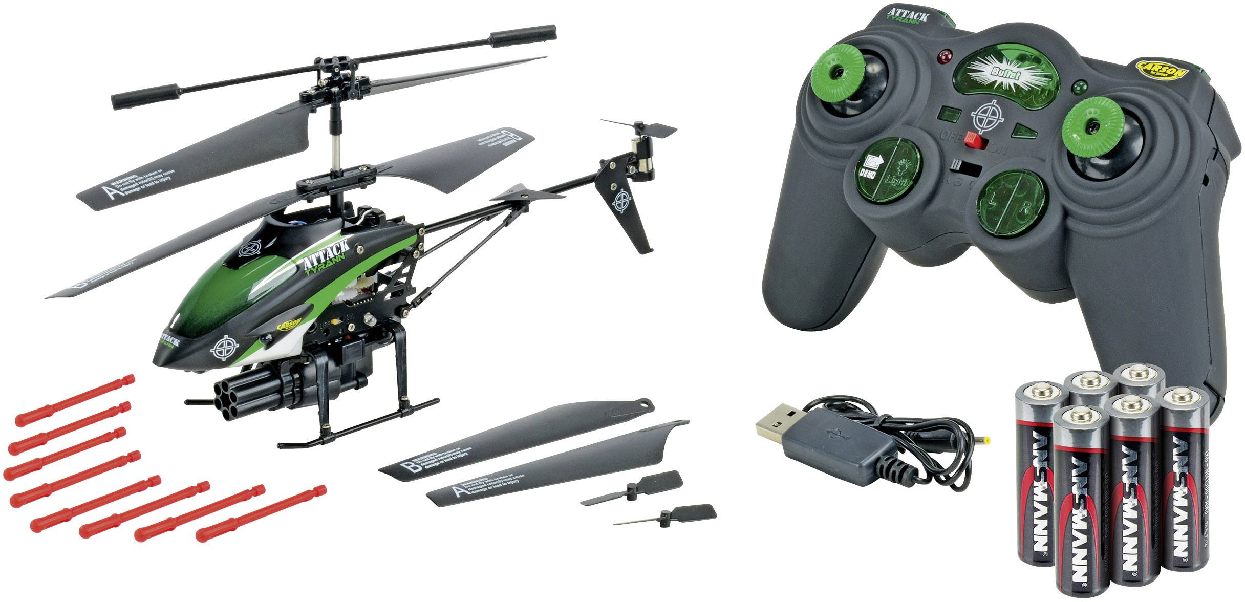 Der ATTACK TYRANN von CARSON ist ein leicht zu fliegender Einsteiger-„Fun-Heli“ mit Sonderfunktionen. Das Modell ist mit einer über den Sender steuerbaren Kanone ausgestattet. Diese kann während des Fluges kleine Pfeile abfeuern. Ebenfalls über den Sender schaltbare LED´s verleihen dem Helikopter eine coole Optik. Easy Handling - Dank elektronischem Kreisel (Gyro) lässt sich der Heli einfach und sicher steuern. Metall-Chassis und Heckausleger sorgen für die nötige Stabilität. Der 100 %-ig komplette Lieferumfang des ATTACK Tyrann erlaubt den sofortigen Flugeinsatz.