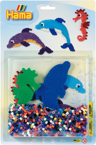 HAMA Set Meer enthält ca. 1100 Bügelperlen, die Stiftplatten Delfin und Seepferdchen, Anleitung und Bügelpapier. Die Motivvorlage ist auf der Packung abgedruckt.