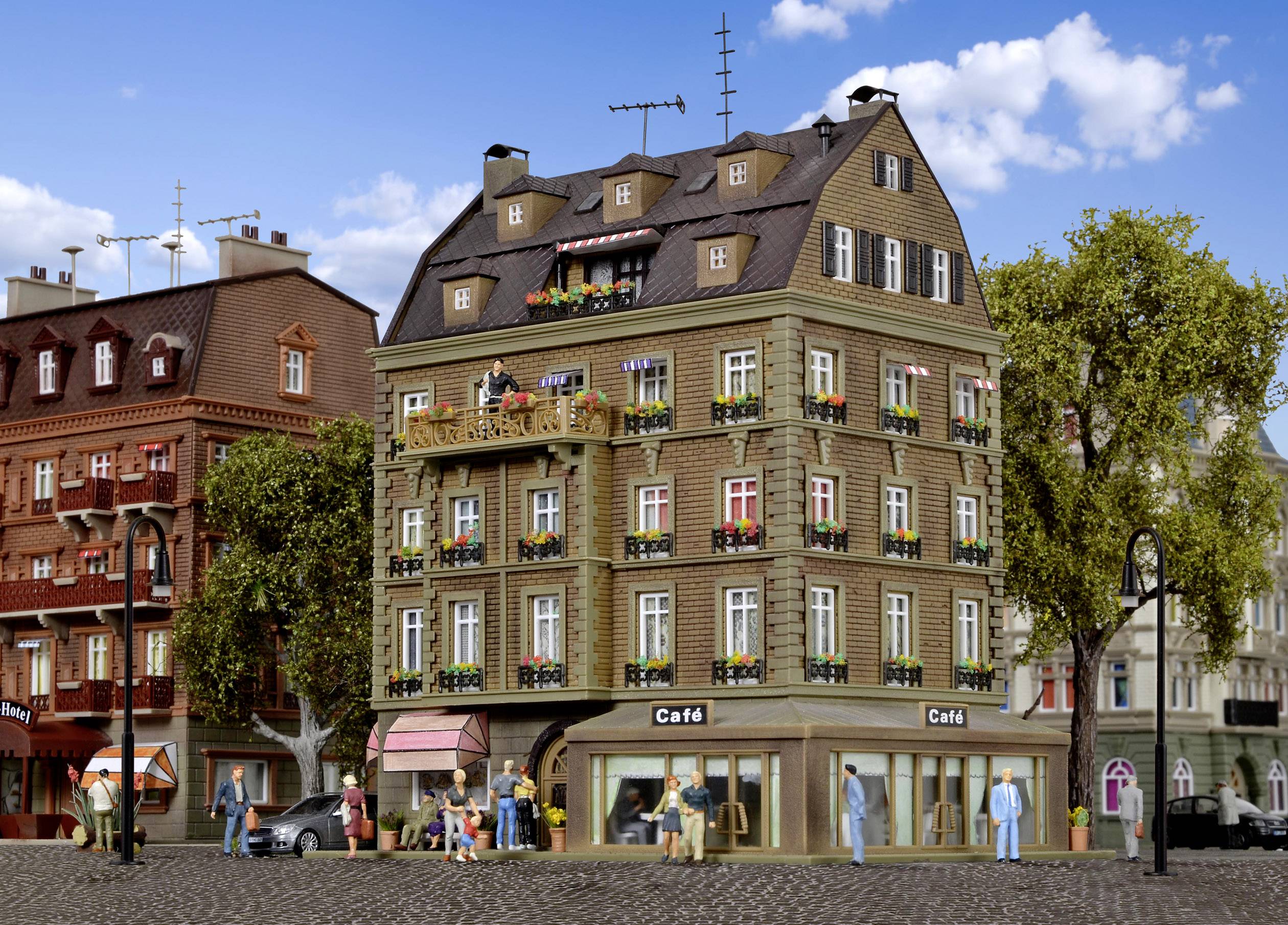 Das Café im Erdgeschoss besticht durch seine große Fensterfläche. Durch sie hat man einen guten Blick in den beleuchteten und mit viel Liebe zum Detail ausgestatteten Innenraum. Das Dachgeschoss ist ausgebaut und in der Mitte befindet sich eine kleine Dachterrasse. Vollmer-Bausatz. Betriebsspannung: 14 – 24 V DC = / 10 – 16 V AC ~