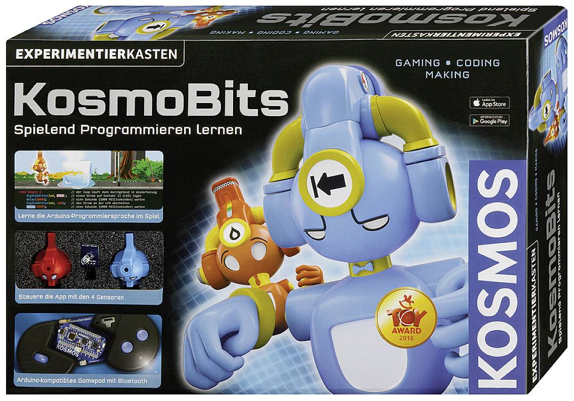 Spielerisch Programmieren lernen! Dieser Experimentierkasten holt Kinder in der Welt der Videogames ab und führt sie Schritt für Schritt ans Programmieren heran. Ausgestattet mit vier externen Sensoren und einem Controllerboard spielen sie sich Level für Level durch die App und erleben die innovative Steuerung von KosmoBits. In jedem Level müssen die Kinder kleine Programmier-Rätsel lösen und lernen so nach und nach die Arduino-Programmiersprache kennen. Schon bald können sie mit Hilfe der Anleitung ihre ersten eigenen Programme für die vier Sensoren schreiben und sie außerhalb des Videogames einsetzen. Es warten viele spannende Projekte wie die lichtempfindliche Schubladen-Alarmanlage oder die LED-Disco, die auf Bewegung reagiert. Ab 10 Jahren.