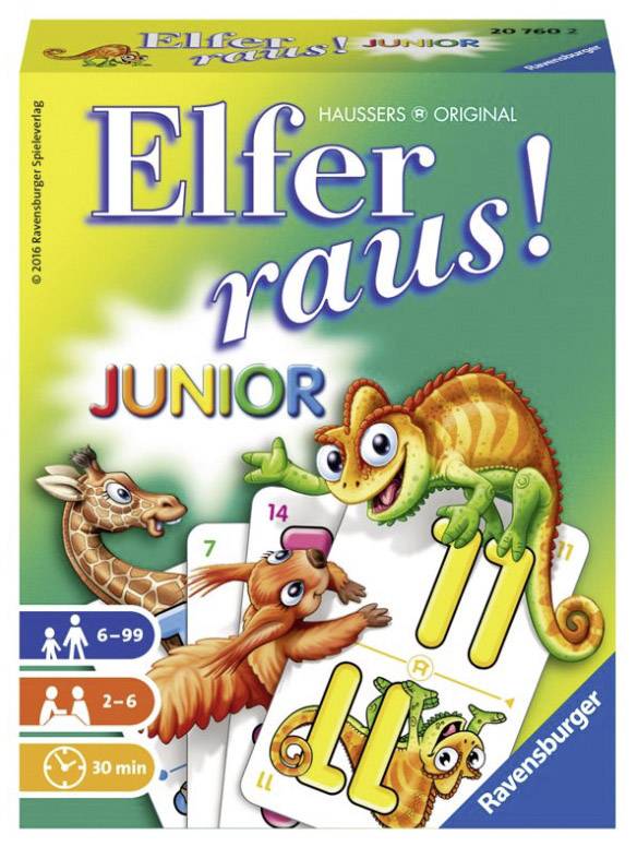 Das beliebte Kartenspiel mit lustigen Tierillustrationen! Mit der neuen Einstiegsregel wird das beliebteKartenspiel auch für jüngere Kinder zu einem tollen Erlebnis. Elfer raus! Junior beinhaltet zwei Spielformen: Das Juniorspiel und das klassische Elfer raus!  Elfer raus! Junior beinhaltet zwei Spielformen: DasJunior Spiel und das klassische Elfer raus!
