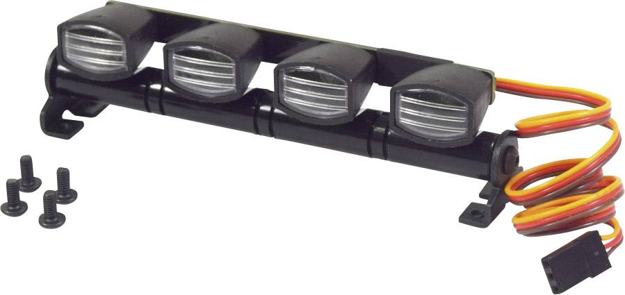 4 LED Leuchten mit 6 Leuchtmodis ( 5 Stroboskopeffekte und Scheinwerfereffekt ) · Leistenlänge 105 mm ( Montagelänge / Abstand Montagepunkte : 93,5 mm ) · Höhe ca. 30 mm · Maße Lampen : 18 x 14 x 16 mm · LEDs weiß leuchtend · Kabellänge Zuleitung 350 mm · BEC Stecker · Stromversorgung 4.8 - 6.0 V · Aluminium Haltebügel / Kunststoff Lampen.