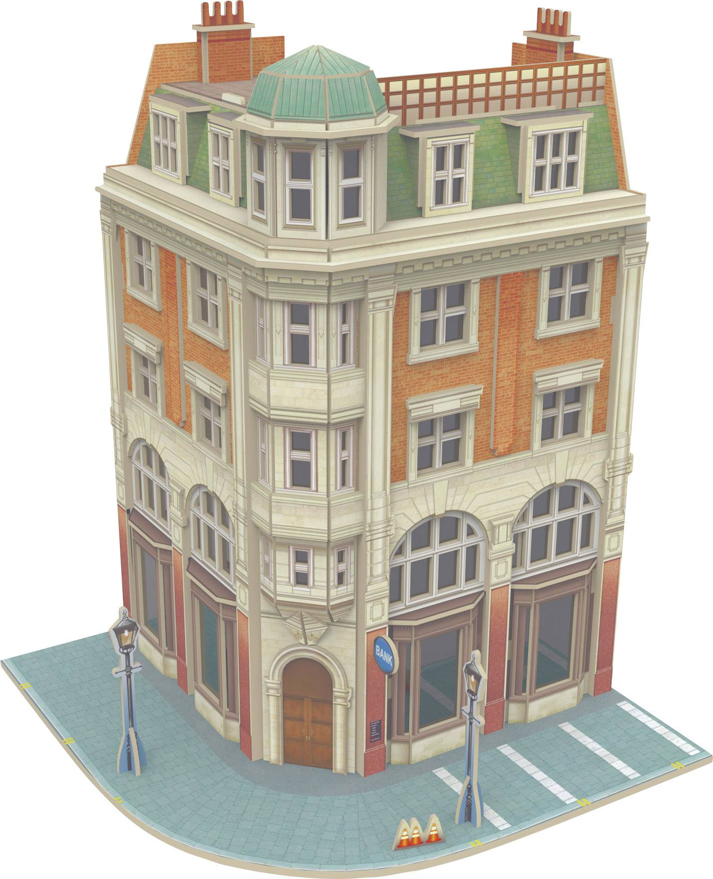 Mehrstöckiges Eckhaus mit Bank-Filiale im Erdgeschoss im Maßstab 1:87. Das Gebäude kann aus 94 Teilen einfach und ohne Verwendung von Werkzeug oder Klebstoff zusammengebaut werden. Bauzeit ca. 2 - 2,5 Stunden. Das 3D Puzzle ist für Kinder ab 8 Jahren geeignet.