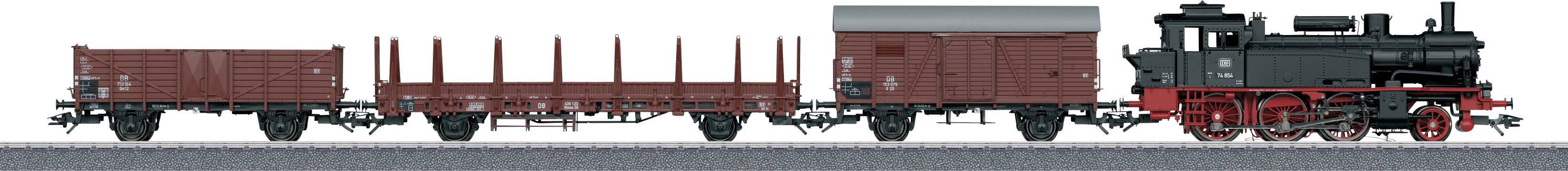 Tenderlokomotive Baureihe 74, offener Güterwagen Om 12, gedeckter Güterwagen Gr 20 und Rungenwagen Rlmms 56 der Deutschen Bundesbahn (DB).