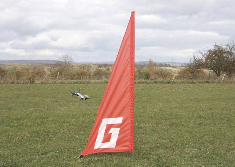Die Turnflag 1500 ist eine Wendemarke passend zum FPV Gate 700 (No.165802). Die Turnflag 1500 ist aus Polyester Stoff gefertigt. Stecken Sie die Flaggenstangen zusammen, die Fahne auf die zusammengesetzte Stange aufschieben, die Stange in den Boden stecken und die Fahne mit den Heringen befestigen und „los geht’s“.