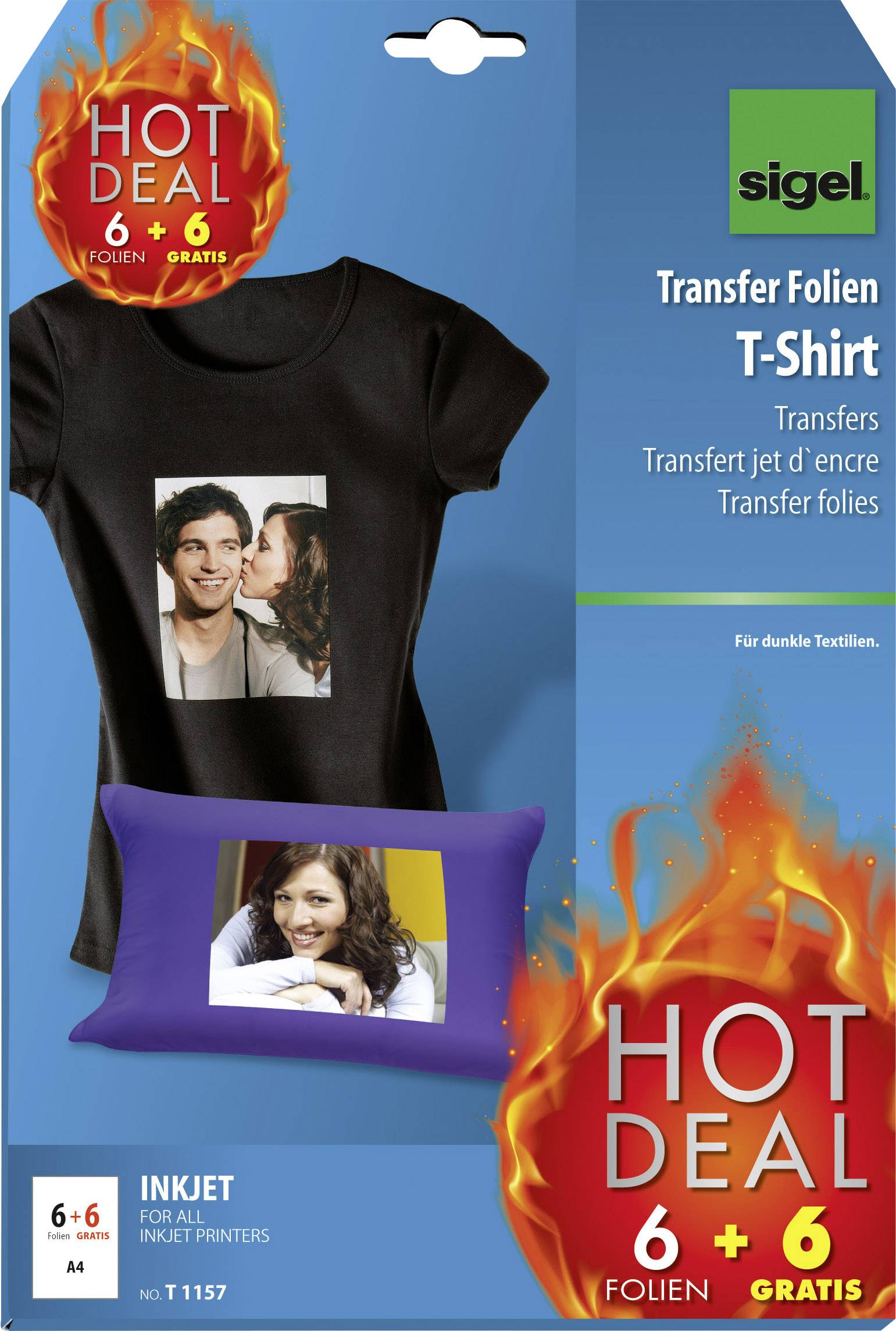 Mit den Transfer-Folien für dunkle Textilien lassen sich T-Shirts, Kissen, Schürzen aus Baumwolle uvm. individuell gestalten. Eine detaillierte Anleitung inkl. Bügelpapier befindet sich in der Verpackung. Für alle gängigen Inkjet-Drucker geeignet. In der Aktionspackung HOT DEAL sind 6 Stück + 6 Folien gratis im Format DIN A4 enthalten.