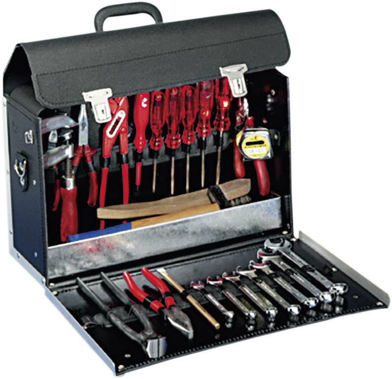 Vorderwand aufklappbar · Bodenschale aus Stahlblech, verzinkt · Verstellbare Werkzeughalteschlaufen auf Vorder- und Rückwand, Vortasche, Ringkappen · Taschenkörper umlaufend mit Aluwinkeln verstärkt.