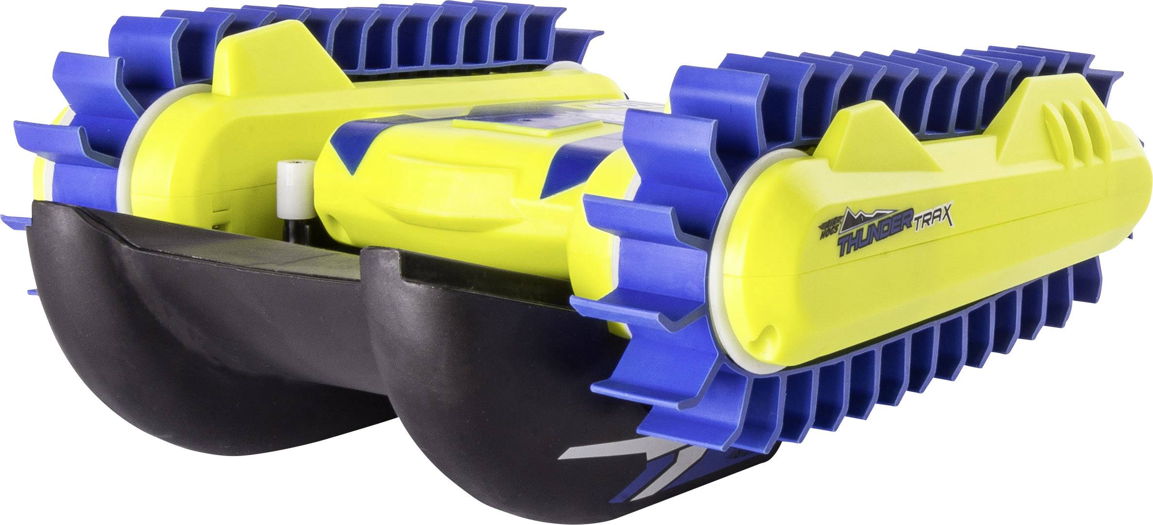 Unaufhaltsam und bärenstark meistert der Thunder Trax jeden Untergrund! Ob Sand, Kies oder Schnee, nicht einmal Wasser hält ihn auf: Denn auf Knopfdruck verwandelt sich das Kettenfahrzeug in ein wendiges Boot - und auch wieder zurück. 2,4-GHz-Steuerung. Ab 8 Jahren.