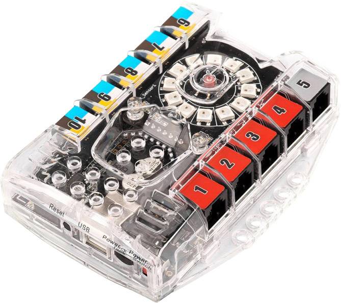 Peripheriegeräte: Gyroskop; Schallsensor; Passiver Summer; Temperaturfühler; 12 PXL LED RGB Panel mit Lichtintensitätssensor