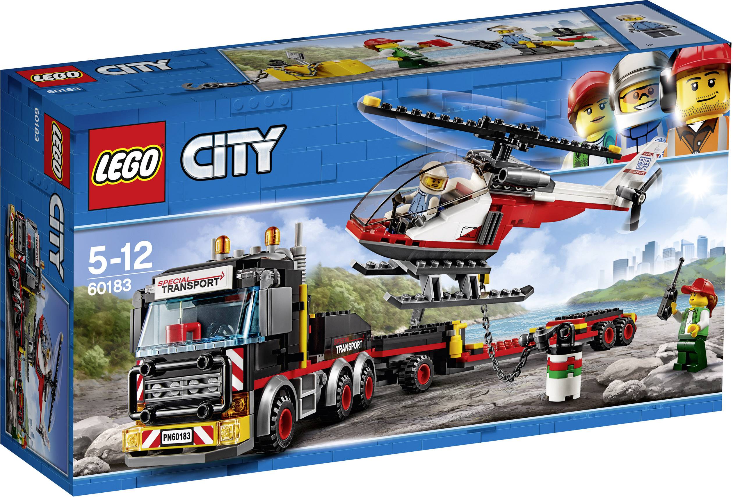 Starte mit dem LEGO® City Schwerlasttransporter zur Baustelle außerhalb der Stadt. Der Schwerlasttransporter enthält eine Fahrerkabine zum Öffnen, einen Werkzeugkasten und einen Bullenfänger sowie einen abnehmbaren, verlängerten Anhänger. Außerdem ist ein Hubschrauber mit drehbaren Rotoren, zu öffnendem Cockpit und eine Kette dabei. Dieses beliebte Kinderspielzeug enthält 2 Minifiguren.