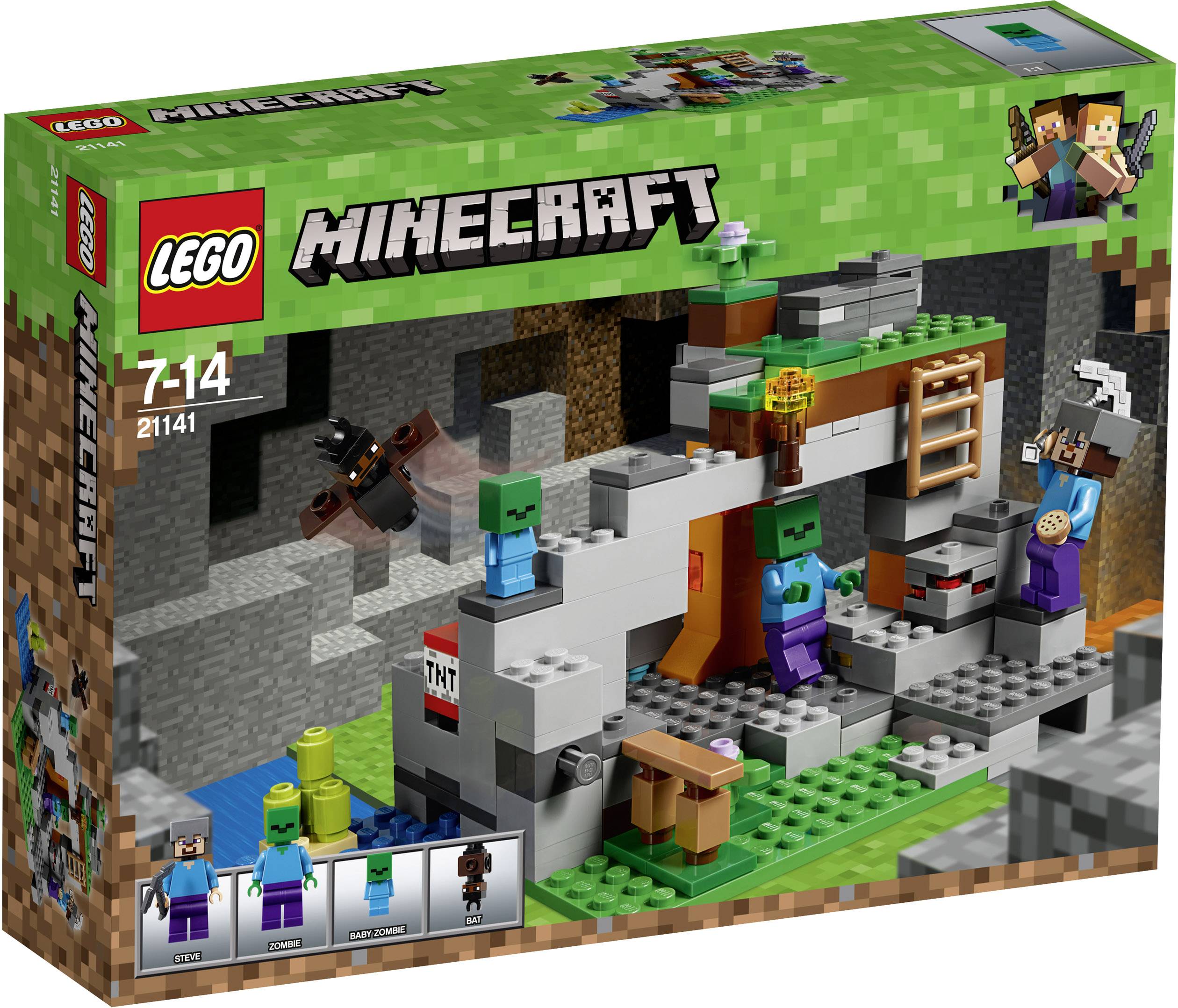 Aktiviere die Sprengfunktion, um dir den Weg in die von Fledermäusen bewohnte Zombiehöhle frei zu machen! Überwältige einen Zombie und ein Zombiebaby und such dann im Berg nach Kohle, Redstone-, Gold- und Diamanterzen. Viel Spaß mit diesem LEGO® Minecraft™ Set für alle Fans den erfolgreichen Sandbox-Videospiels und den interaktiven Minecraft-Abenteuern. Kombiniere dieses Set mit anderen LEGO Minecraft Modellen und gestalte dein eigenes einzigartiges LEGO Minecraft Universum. Enthält außerdem die LEGO Minecraft Minifigur Steve.