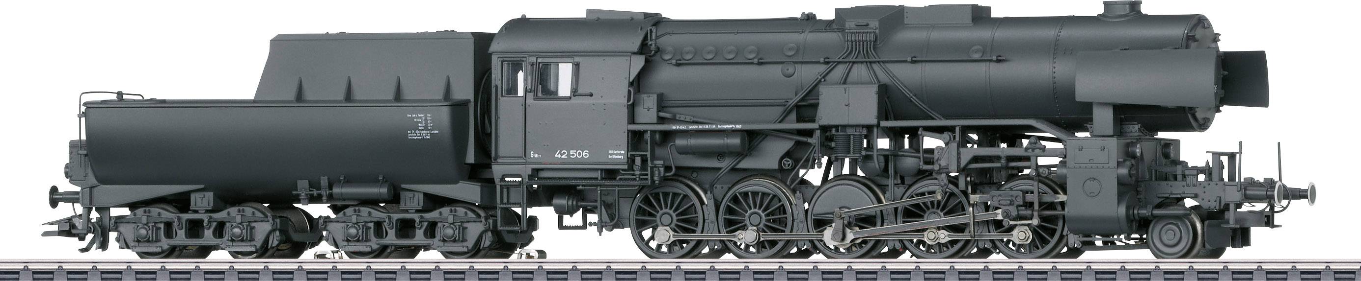 Schwere Güterzug-Dampflokomotive Baureihe 42, mit Wannentender 2´2´T30 der Deutschen Reichsbahn (DR). Schwarzgraue Grundfarbgebung. Mit Witte-Windleitblechen der Regelausführung, Vorlauf-Radsatz mit Vollrädern, beide unteren Stirnlampen vorne an der Lok im Zylinderblock eingebaut. Kein Löscheschutzblech unterhalb der Rauchkammertür. Lok-Betriebsnummer 42 506. Betriebszustand um 1944.