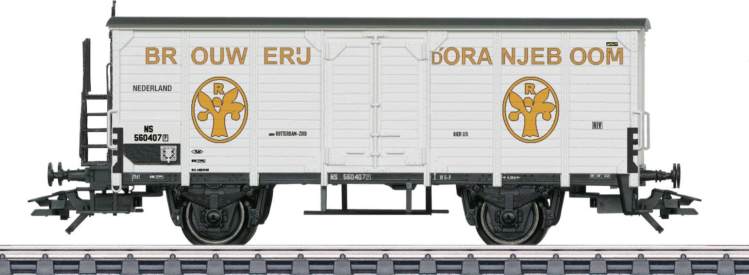 Zweiachsiger gedeckter Bierkühlwagen mit hochgestelltem Bremserstand. Privatwagen in der Gestaltung "Brouwerij D'Oranjeboom", eingestellt bei den Niederländischen Eisenbahnen (NS). Betriebszustand der Epoche III.