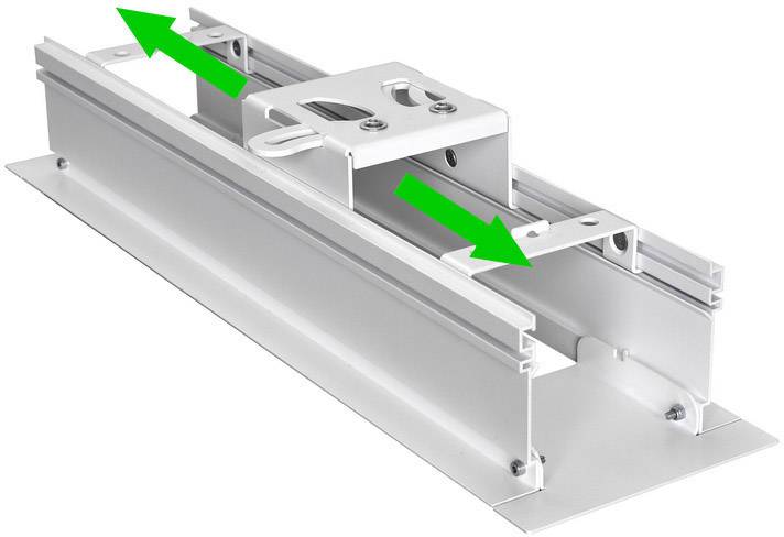 Befestigungsbügel zur Aufnahme der Gewindestangen sind über die gesamte Längsachse des Einbaurahmens verschiebbar; freie Positionierung der Halterungen auf einer empfohlenen Länge von bis zu 50 cm jeweils rechts und links, anpassbar an eine Vielzahl räumlicher Bedingungen