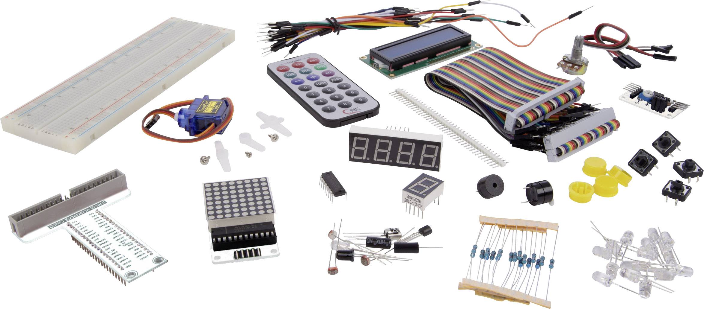 Steckplatine, lötfrei, 830 Löchern + 5 x Widerstand 10K (RA10K0) + 5 x 2K Widerstand + 5 x 220R Widerstand (RA220E0) + 1 x 1602 LCD-Modul (LCD1602BLC) + 1 x GPIO-Steckkarte, T-förmig + 1 x Bandkabel für GPIO-Steckkarte + 1 x IR-Empfänger VS1838 + 1 x Mini-Fernbedienung für VMA317 + 1 x 50K Potentiometer (K047AM) + 4 x 4-pol. Taste mit runder Kappe 12 x 12 mm + 1 x 40-pol. einreihige Stiftleiste 2.54 mm + 3 x Fotowiderstand LDR 0.1-500K + 1 x Temperaturfühler LM35 (LM35DZ) + 1 x aktiver Summer 5 V + 1 x passiver Summer 5 V + 30 x Steckbrücke, Stecker - Stecker, verschiedene Längen + 1 x 20-pol. Steckbrücke, Stecker - Buchse, 20 cm + 1 x Micro Servo 9 g (VMA600) + 1 x MAX7219 + 1088AS 8 x 8 LED-Matrix + 1 x PCF8591 A/D-Wandler + 3-pol. Steckbrücke + 1 x 5 mm RGB-LED + 1 x Flammensensor YG1006 (IR-Photodiode) + 2 x Neigungsschalter (MERS4) + 1 x Schieberegister 74HC595N + 1 x 1-stelliges 7-Segment-Display SMA42056 + 1 x 4-stelliges 7-Segment-Display SMA420564 + 1 x transparente