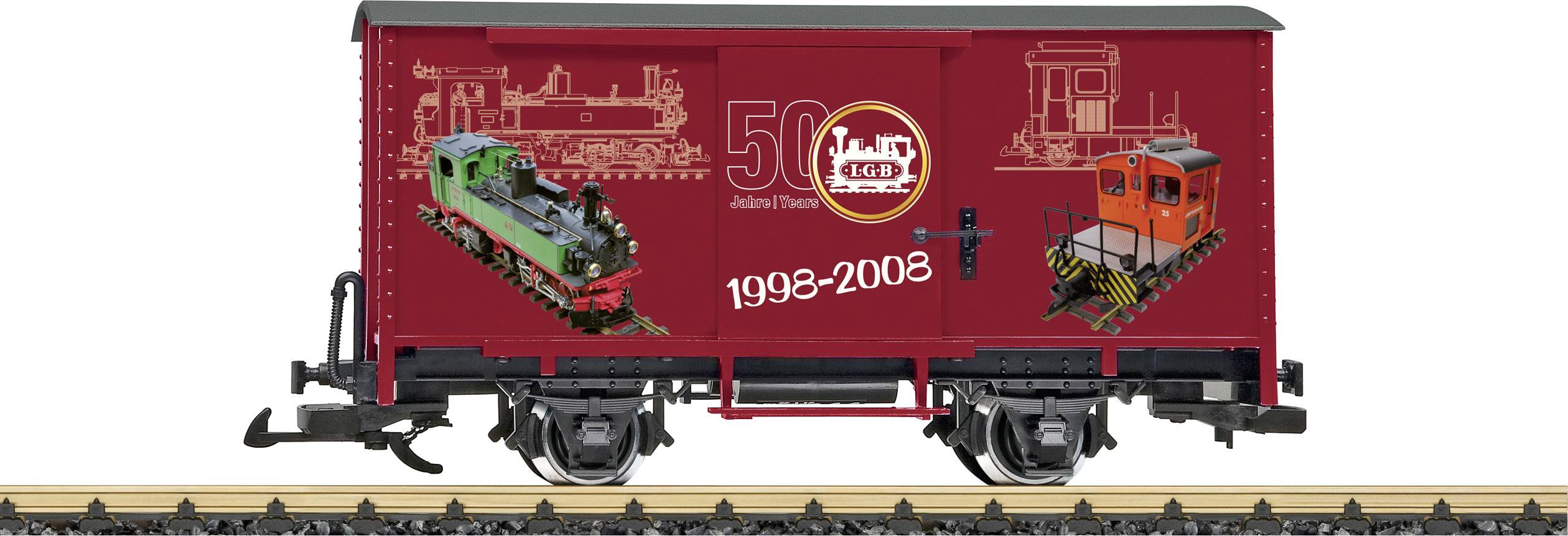 Modell eines zweiachsigen gedeckten Güterwagens in einer speziellen Farbgebung anlässlich des 50. Jubiläums der LGB - Gartenbahn. Bedruckt mit den schönsten Modellen aus den Jahren 1998 bis 2008. Seitliche Türen zum Öffnen. Metallradsätze. Länge über Puffer 30 cm.