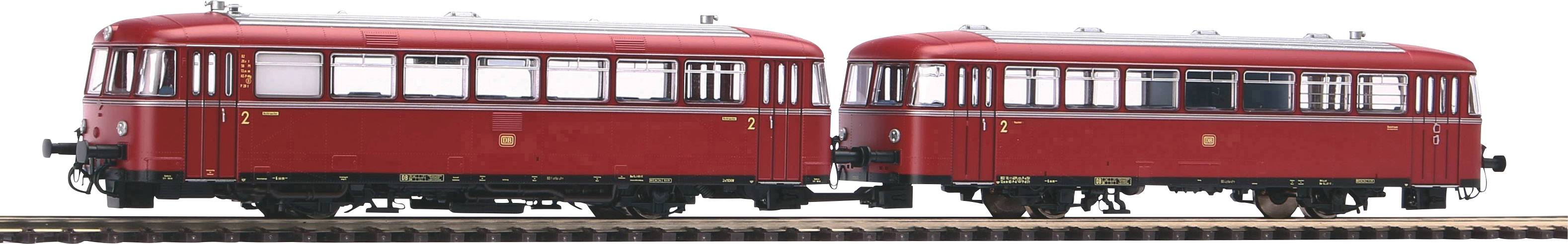 Mit dem Modell des legendären Schienenbusses VT 98/VS 98 mit Sound der DB offeriert PIKO ein weiteres perfekt auf den Einsatz auf Modellbahnhaupt- und Nebenstrecken abgestimmtes Fahrzeug mit vielen Highlights. Erstmals werden hiermit Modelle in Großserie von Fahrzeugen der frühen Bauserien angeboten. Das Modell wird von einem starken Kleinstmotor angetrieben, der zugunsten einwandfreier Laufeigenschaften mit Schwungmassen ausgestattet ist und besitzt für optimale Fahreigenschaften ohne Soundunterbrechungen einen ab Werk eingebauten Pufferkondensator. Der Antrieb wirkt auf beide Achsen des Triebwagens. Trieb- und Steuerwagen sind über eine stromleitende Kurzkupplungskinematik miteinander kuppelbar. Die Beleuchtungsfunktionen beider Fahrzeuge, u.a. auch die Lampen über den Führerständen, sind gesondert schaltbar. Freier Durchblick durch die Fahrgasträume ist möglich. Er lässt sich vorbildgerecht auch für die Mitnahme von Güterwagen verwenden. Der ab Werk eingebaute PIKO Sounddecoder 4.1 der neuesten Generation beherrscht die Datenformate DCC mit RailComPlus®, Motorola®, Selectrix® und ist mfx-fähig. Der verbaute Lautsprecher ist genau auf den Triebwagen abgestimmt. Viele typische Geräusche wie Motorengeräusch, Signalhörner, Bremsenquietschen und weitere schaltbare Funktionen sind einzeln abrufbar. Mit einstellbarem individuellem Mapping für bis zu 44 Funktionen. Das Schlusslicht ist separat schaltbar. Sound ist auch im Analogbetrieb möglich – nur Motorengeräusch. Bremsschläuche zum optionalen Aufrüsten für den Vitrineneinsatz liegen bei.