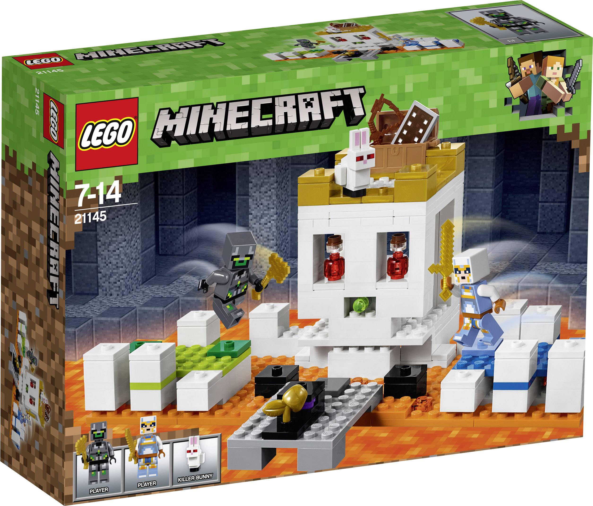 Enthält 2 LEGO® Minecraft™-Minifiguren mit eigenem Minecraft-Skin sowie ein Killer-Kaninchen als zusätzliche Figur. · Das Set „Die Totenkopfarena“ enthält eine baubare LEGO® Minecraft™-Kulisse mit einem großen Bauwerk in der Form eines Schädels, Lava, einem grünen und einem blauen Spielerpodest, einer Plattform mit goldenem Apfel und einem Raketenshooter, der eine Schleimrakete abfeuert. · Schnapp dir dein Goldschwert oder deine Goldaxt und weiche dem Schleimshooter aus, um den goldenen Apfel zu gewinnen. · Besiege das Killer-Kaninchen, um dir die Heiltränke und eine Truhe mit Schild und Bogen zu holen. · Die Ausrüstung umfasst einen Bogen sowie eine Goldaxt und ein Goldschwert. · Als Zubehör sind 2 rote Heiltränke, eine Truhe und ein Schild enthalten. · Lass deiner Fantasie freien Lauf und baue weitere LEGO® Minecraft™-Modelle mit dem Set! · Dieses Set enthält mehr als 195 Steine. · Die Totenkopfarena ist 11 cm hoch, 24 cm breit und 16 cm tief.